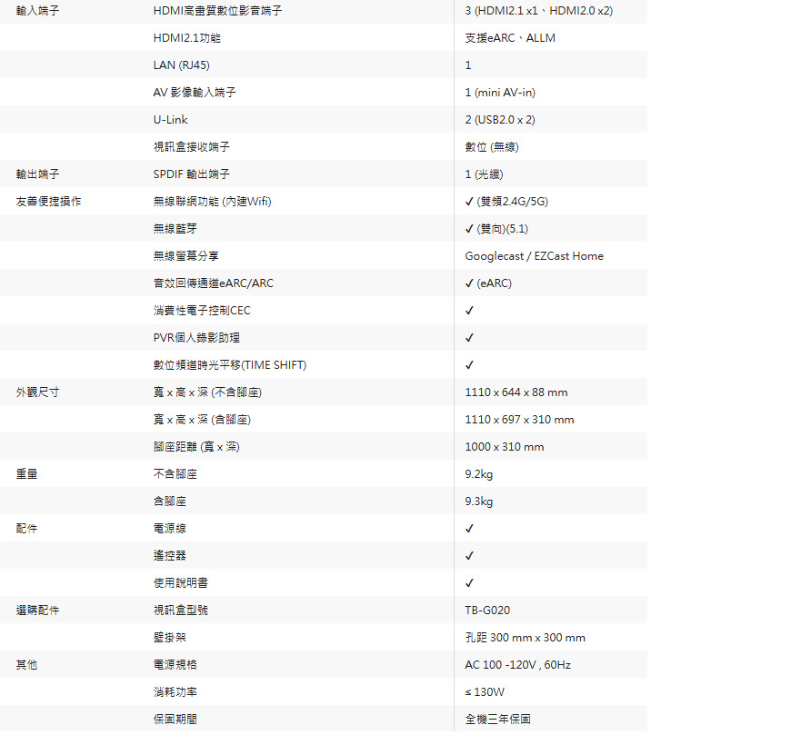 尺寸外觀-寬 x 高 x 深 (不含腳座):1110 x 644 x 88 mm