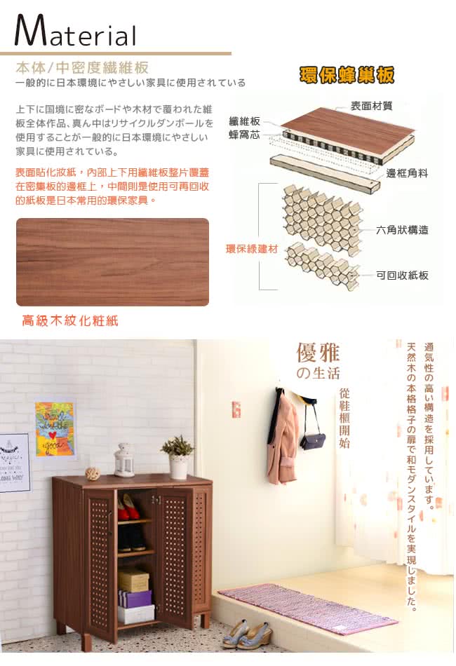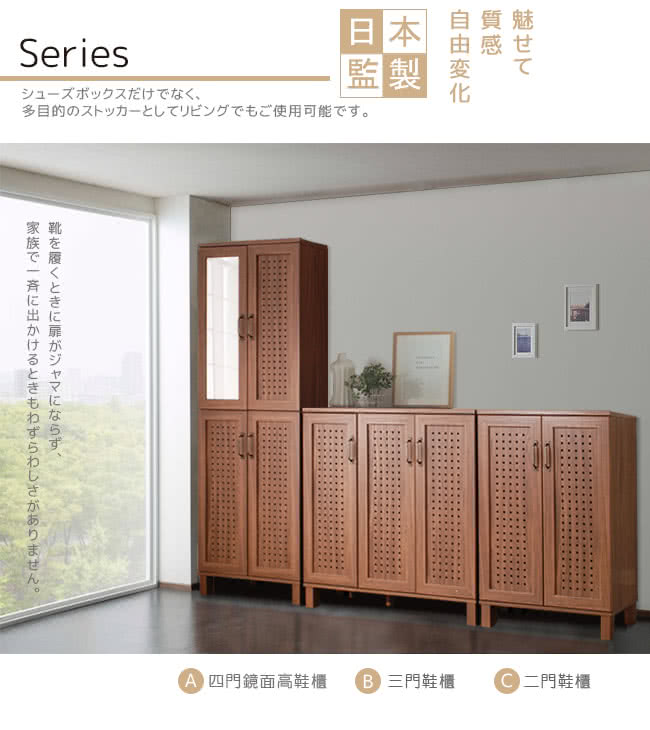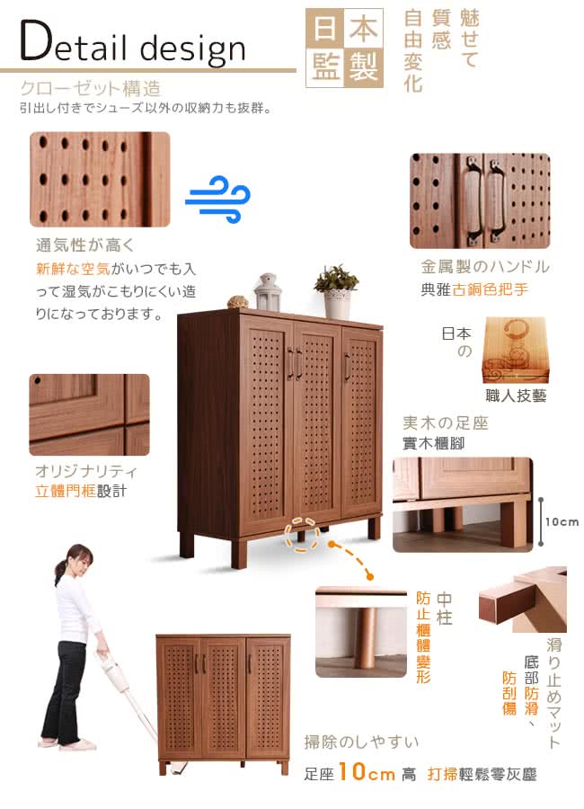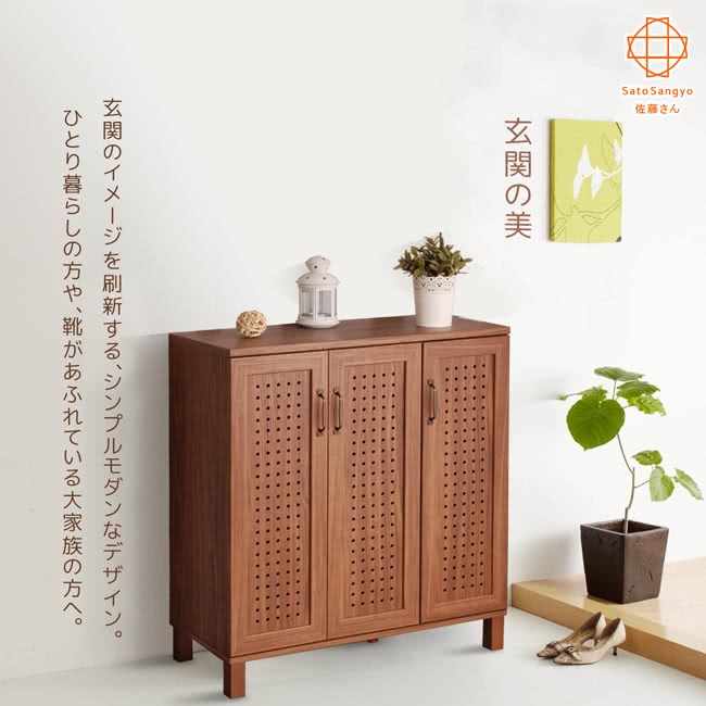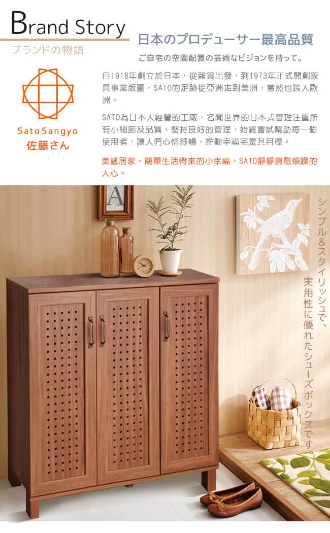 以圓孔設計展現出宛如法式的優雅,自然簡約地展現出空間中的高雅風情,彰顯出設計的內斂溫文個性。筆直的簡約俐落線條經過重新的比例編排,就能展現截然不同的設計表情,也能在空間中品味地揮灑出醇厚曲調。蘊含的概念,歷經無數次的人性思考,怎麼樣才能兼具外型與舒適,透過敏銳的觀察,不斷的思考進化,和人文、材質特性與創新…等多種可能性激盪火花,可摩登可優雅,自然材質的溫潤、色澤、質感、紋理,讓減法線條的鞋櫃、收納櫃…各種用途因地制宜,8層板高度自由決定,多種用途變化,不只是鞋櫃,也同時是CD或書及收納櫃,多種可能性融入於空間,遇見了美好。 【Sato】日本品牌,職人精神的手工、講究獨特的細緻、質感上乘的細節、豐富變化品味極致。寬度87公分加寬尺寸,鞋櫃內深度達33公分,男鞋或大尺寸女鞋也放得下,全家大小的鞋子皆可收納。三門8層板,大小層板搭配,可收納20雙各類鞋款,排孔設計任意調節層板高低,無論是高筒靴、高跟鞋、球鞋、男鞋、大尺寸鞋…設想周全,L型五金穩固側邊與層板,100%穩定不位移,螺絲孔皆附有冒蓋,細微處也注重美感。