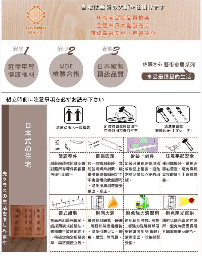 【Sato】日本品牌,職人精神的手工、講究獨特的細緻、質感上乘的細節、豐富變化品味極致。蜂巢板高級木紋化妝紙,內部蜂巢板具有高平坦性、隔音、隔熱及質輕等特徵,承重力的強度高、剛性優越,隱約看見科技產品與人文質感間的完美融合。設計上講求「恢復休養感官的空間」為靈感,讓每個人都能找回真樸的自我。背板設定為斜角固定,有別於市售收納櫃採用平行式螺絲的缺點,此斜角螺絲固定於二邊,且長達2公分,有效固定背板,堅固、穩定、不易鬆脫、不滑落、不傾斜,螺絲孔處附木紋貼片予以美化,細微處也注重美感。