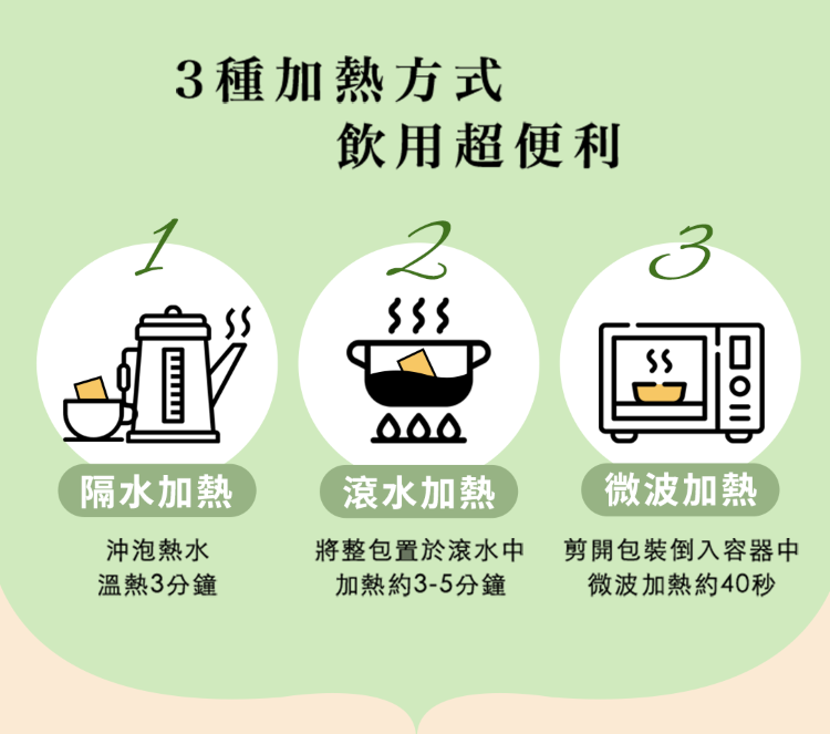 浸泡加熱:將「未拆封」的滴雞精放入盛裝熱水的容器中浸泡2~3分鐘