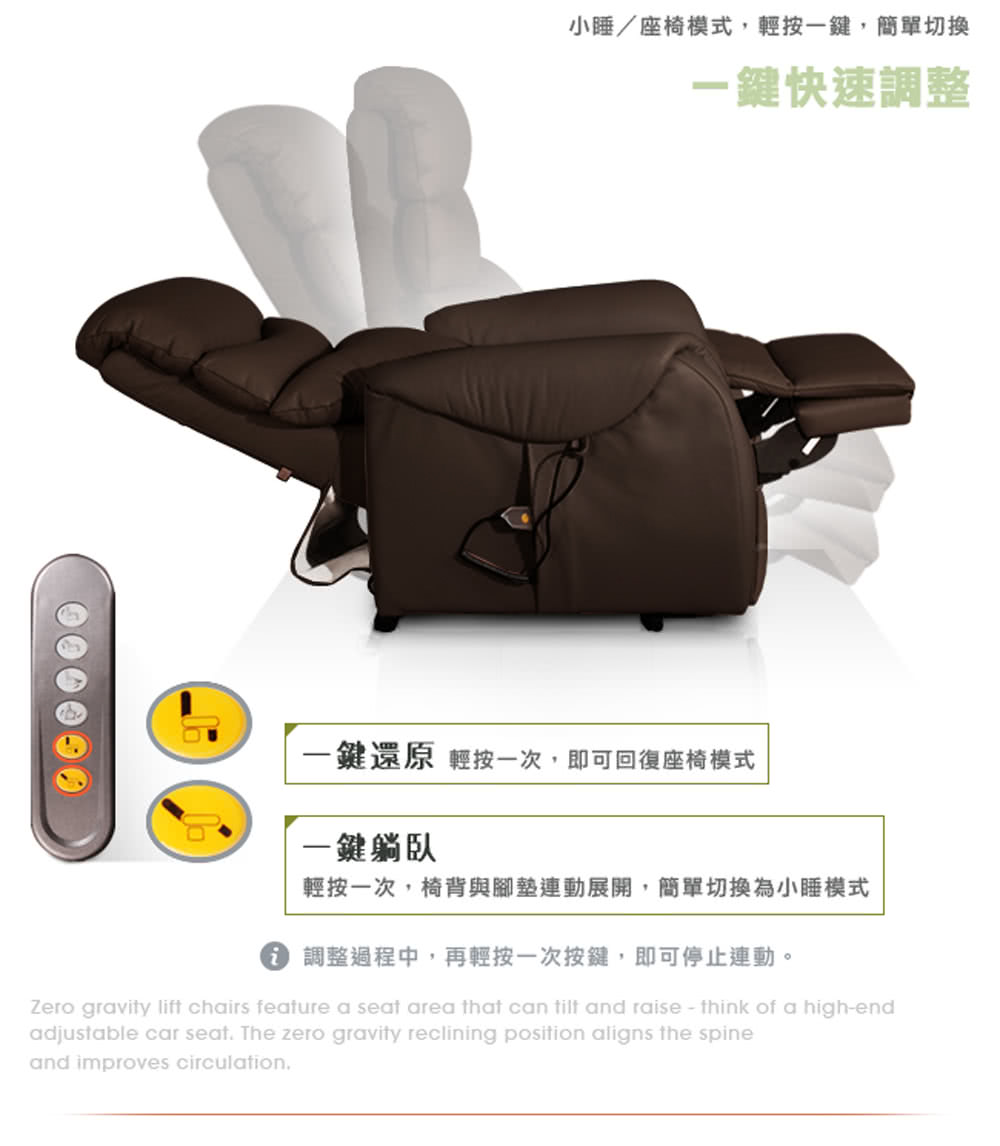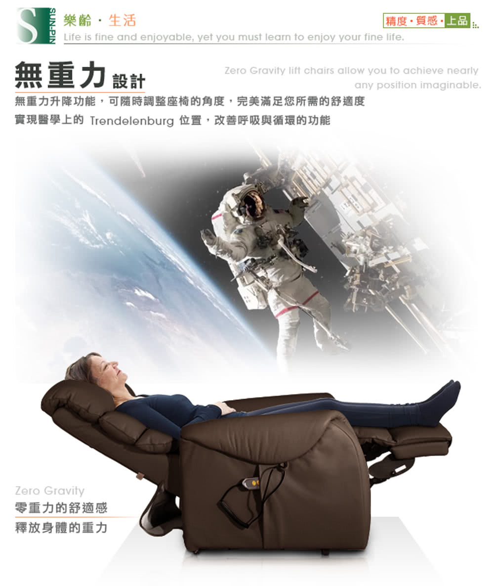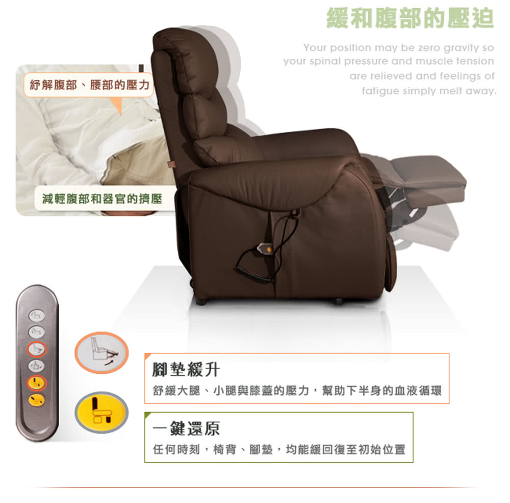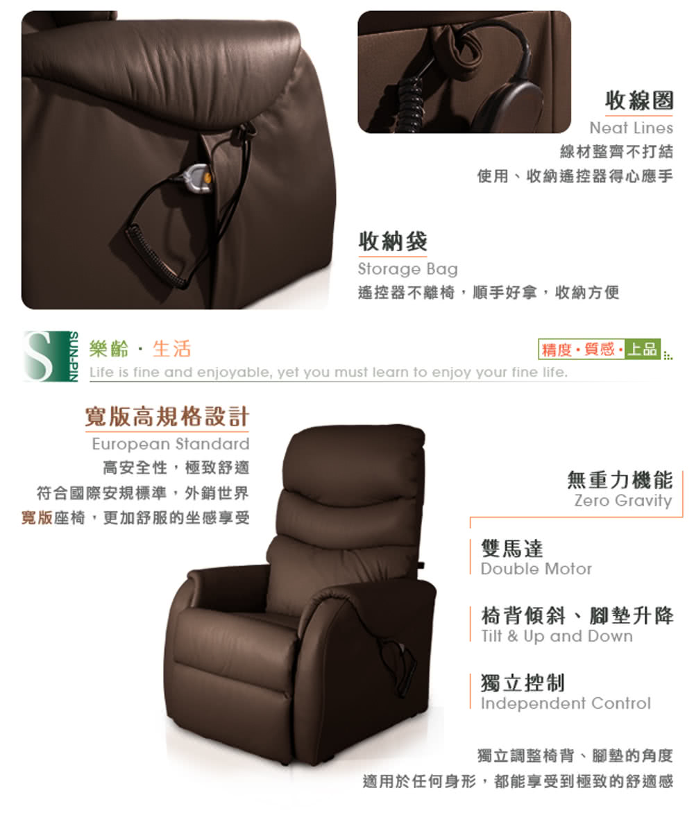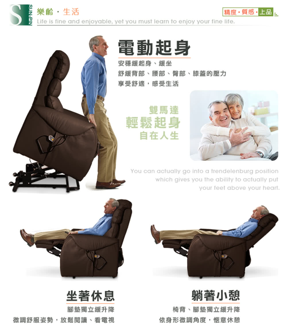 【Sun Pin】Deirdre迪德黎伯爵無重力起身椅(全牛皮雙馬達)深棕。無重力設計,舒緩重力對背部與腰部的壓力,減輕肌肉的負擔,讓全身可以徹底放鬆,安心休息。對於有背部、腰部的疼痛、或肩部、頸部酸疼的情形,能紓解不適,無負擔的躺臥與起身。全牛皮設計,採用頂級厚牛皮(頭層皮),厚度1.3~1.5mm,絕佳的透氣性、耐磨性及抗拉強度。深棕色靜謐地彰顯優雅品味。厚牛皮隨着時間而沉澱,光澤度越高,越用越有韻味。優雅的角度,散發出一股卓越的設計質感,典雅沉穩地成為了居家的重心,讓它给人一種精品的感覺,使空間躍動了生命力。