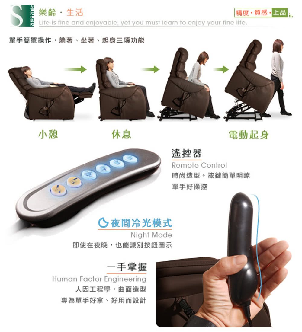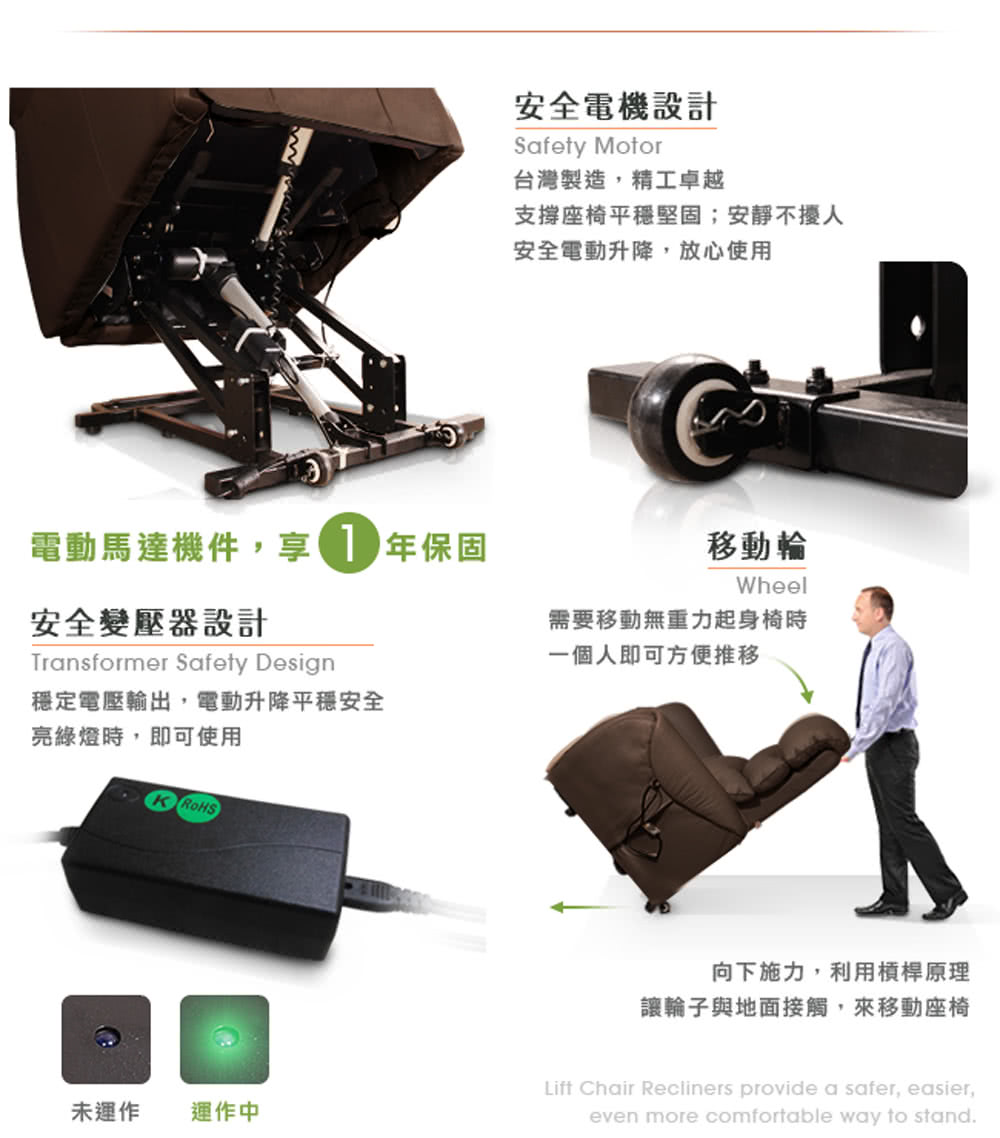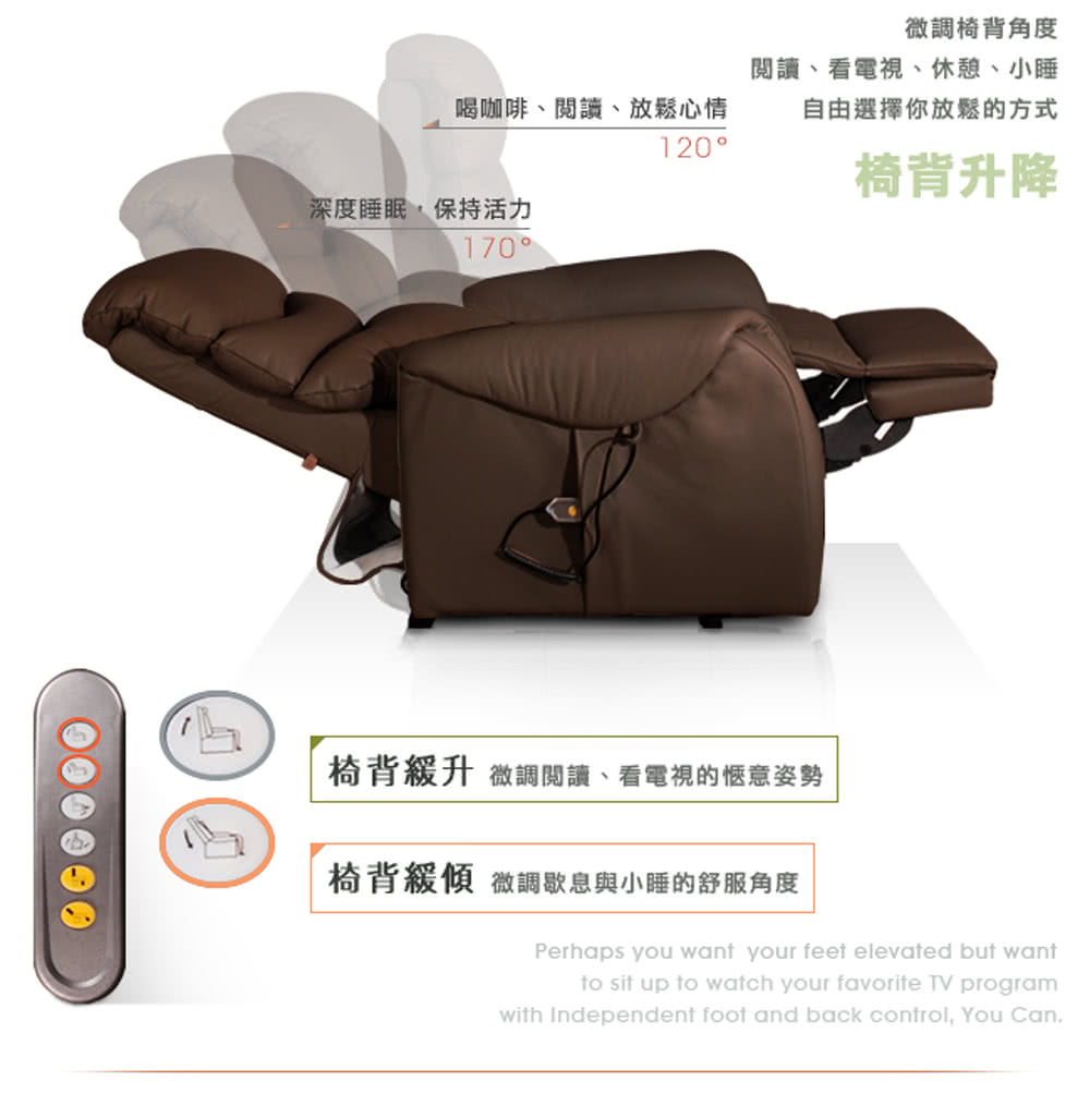 用最好的設計,給家人極致的舒適。以智能生活的思維,設計單手好操控的觸控面板,即可電動控制傾斜角度。通過SGS國際認證機構,不含甲酫皮革染色、無PCP、重金屬(六價鉻)、偶氮染料的無毒測試報告。變壓器、電線、插頭均通過安全測試。進口電動機具,享一年免費原廠保固,耐荷重100公斤。高安全性與耐用性,讓您坐得放心,用得安心。
