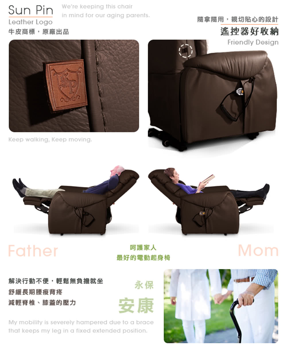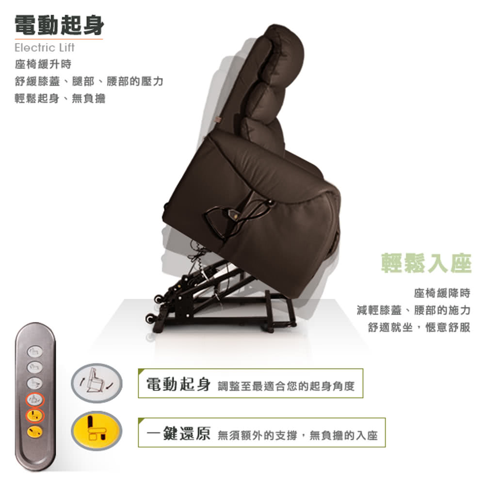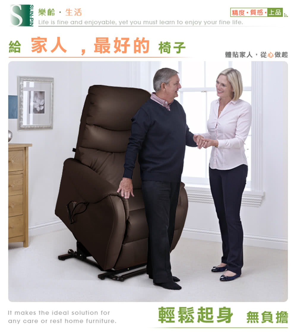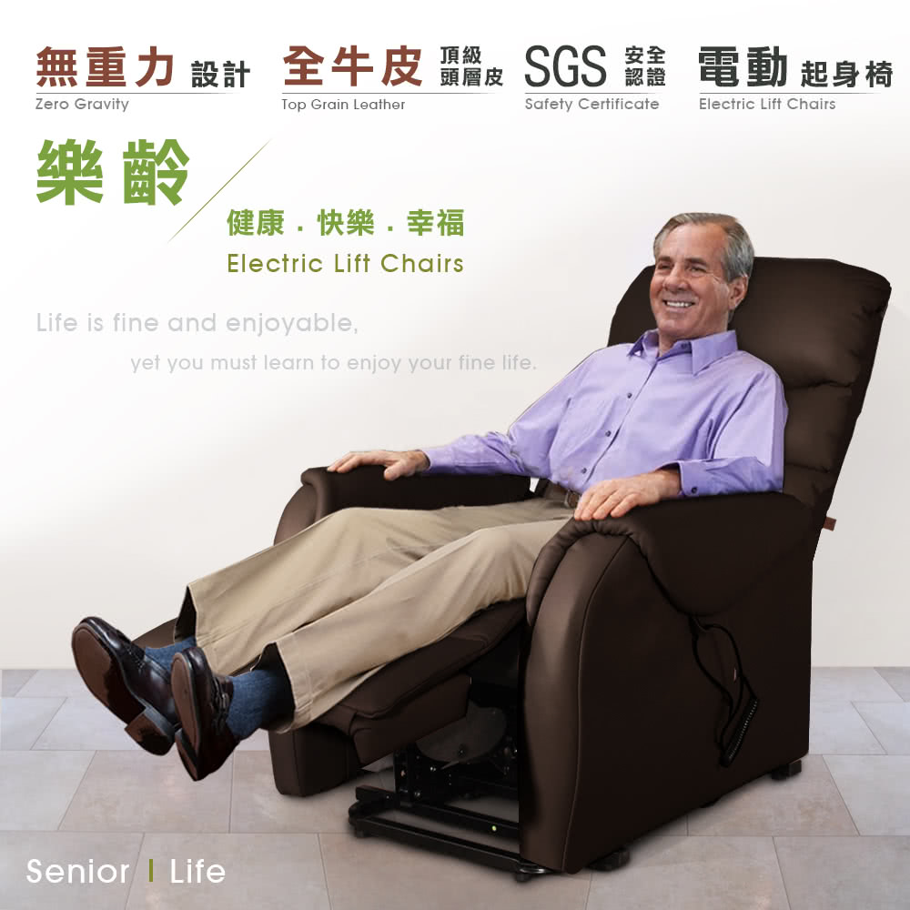 無重力電動起身椅耐荷重100公斤,可緩起及緩坐,協助銀髮族輕緩的起身及坐下。銀髮族、年長者、需要他人攙扶才能起身者、自行起身及經常腰痠背痛者特別適用,免人扶,節省腰力好輕鬆,家有一老如有一寶,好好寶貝家中的長輩吧!【Sun Pin】Deirdre迪德黎伯爵無重力起身椅(全牛皮雙馬達)深棕,就是孝順銀髮族與樂齡年長者,最佳的電動休閒躺椅!電動機具部分保固一年,隨貨附保證卡維護消費者的權益。專人到府安裝、定位、測試服務。高品質、高安全性,給家人最好的電動起身椅。