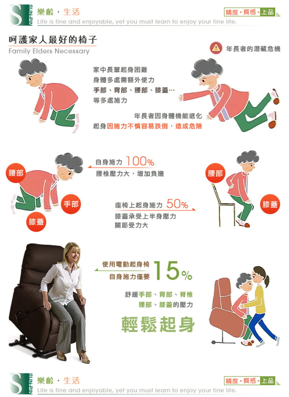 世界衛生組織提出警告:骨質疏鬆症是僅次於心血管疾病,造成健康威脅的第二大問題!年紀愈長,被稱為『無聲殺手』的骨質疏鬆症越容易發生。正因骨質疏鬆是無聲無息的,許多長輩常誤以為上了年紀,自然就會腰酸背痛,反而沒有好好保護自己的脊椎及髖骨,長期受到過度的壓力。究極細膩的專業研發團隊,創造極舒適的高品質居家環境,生活中的藝術敏銳度與創造性,提升高齡者與行動不便者,及文明病腰痠背痛者的生活品質,協助銀髮族輕緩低起身及坐下,遙控一按可控制昇降,起身躺臥好輕鬆。