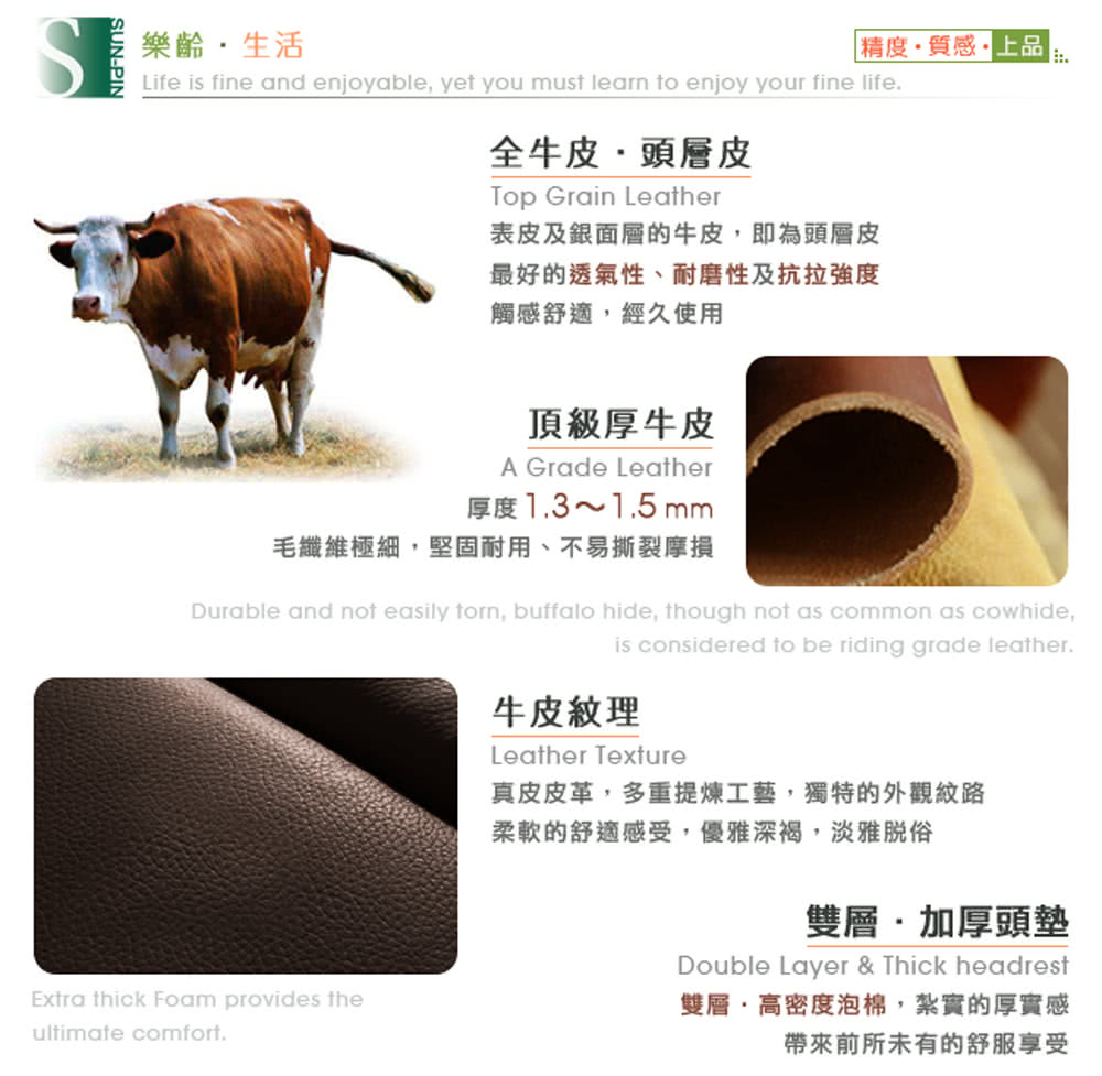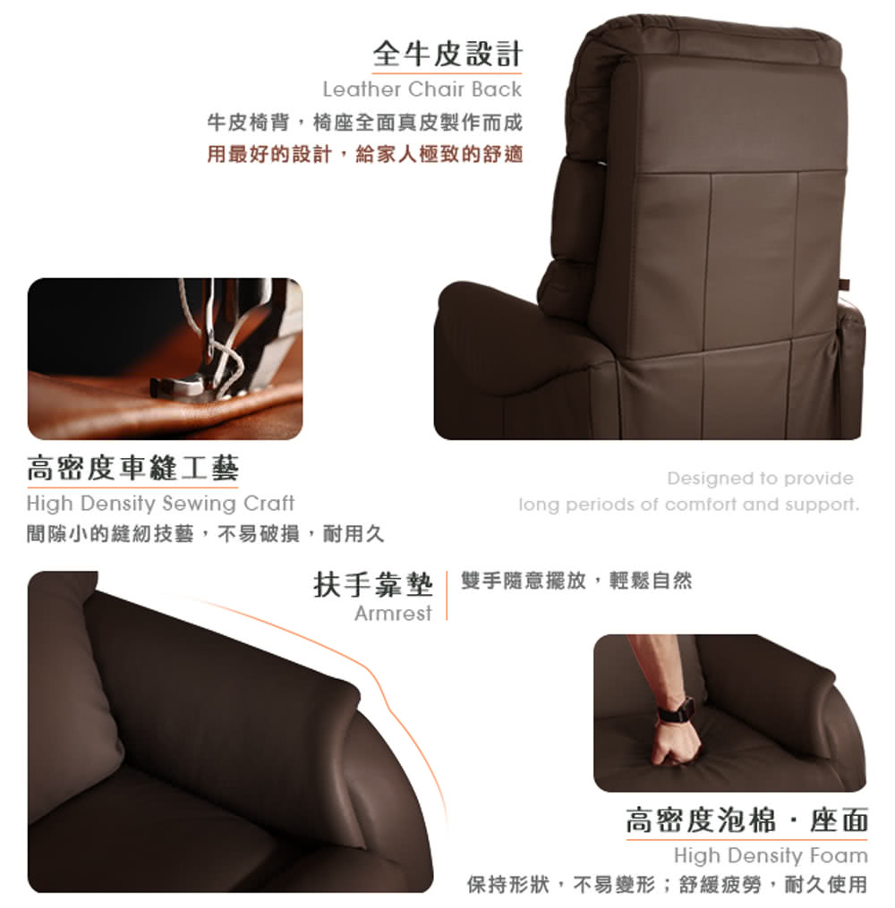 • 全牛皮設計,採用頂級厚牛皮(頭層皮),給家人最棒的極致舒適