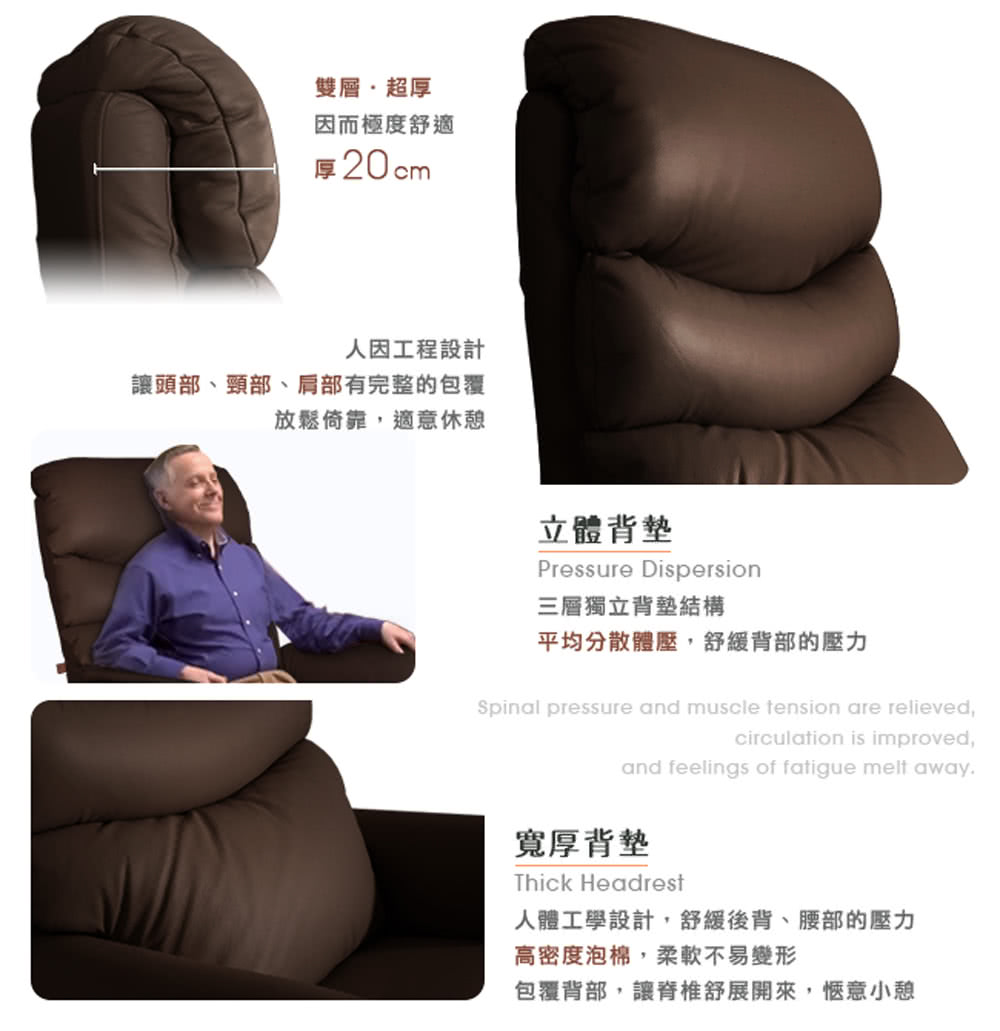 雙層加厚頭墊,紮實的厚實感,帶來前所未有的舒適感受。三層獨立背墊的結構,平均分散體壓,舒緩背部的壓力。椅背採人體工學弧度設計,包覆性絕佳,使頭、頸部、背脊能自然紓壓。高密度泡棉,保持形狀,不易形變;舒緩疲勞,耐久使用。椅座側邊收納袋,取用與收納遙控器方便快速,輕鬆操作。實木框架結構,經過嚴謹的試驗,提供絕佳的支撐力。拖臂式電動機具,有效撐起椅體並穩固椅座,品質精良低音頻,安全靜音不擾人。
