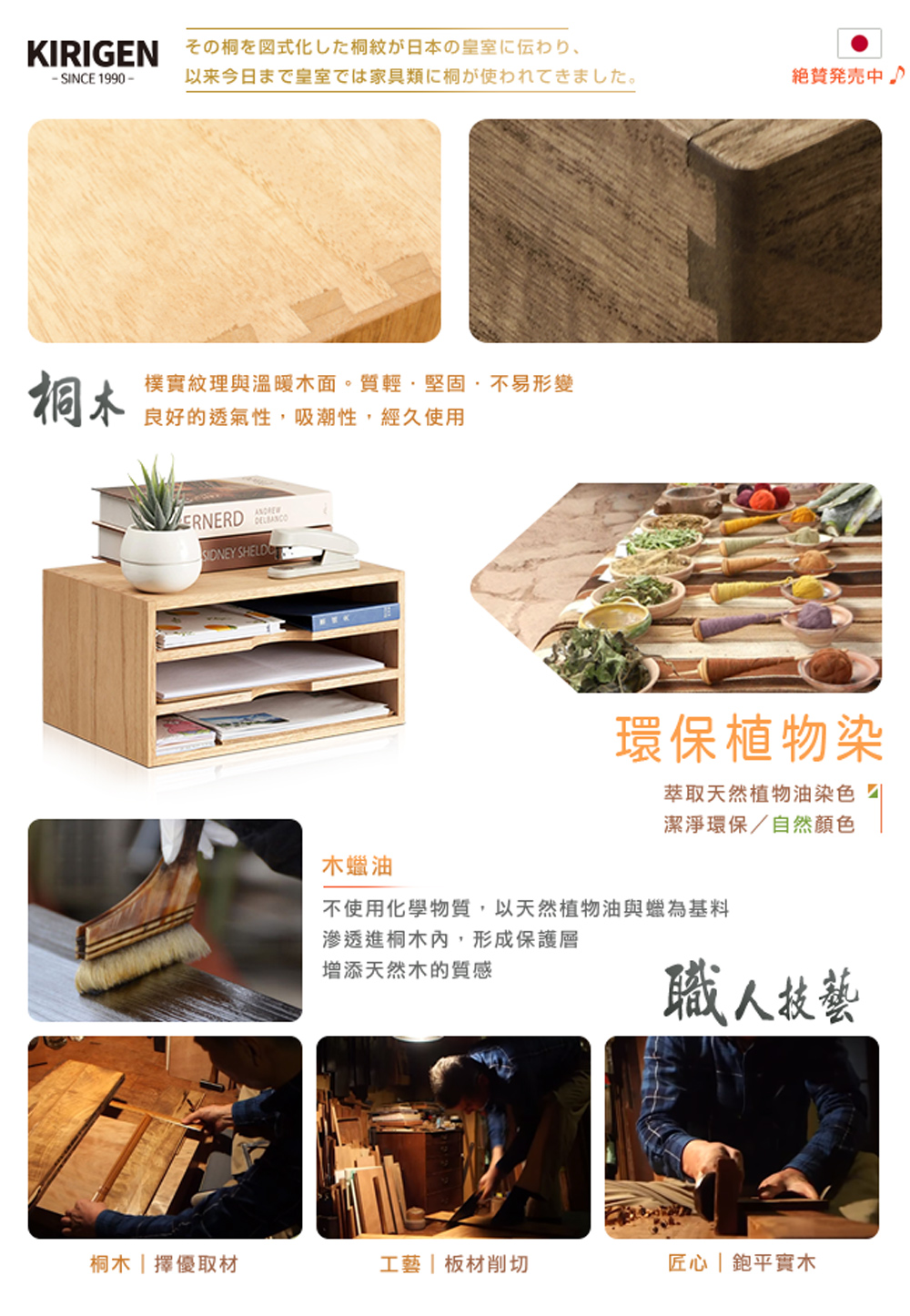 桐木質輕且不透濕氣,少分叉與歪斜,其木質特色特別適合台灣海島型潮濕氣候。特性重量輕、吸潮、透氣性好、不易變形、結構穩定性強、顏色好看。木材紋理通直,刨光後有絹絲光澤。桐木有很好的象徵意義,象徵富貴,被認為是高級木材之瑰寶。自古以來,是日本皇室御用的傢俱,尊貴不凡,而今依舊如此。