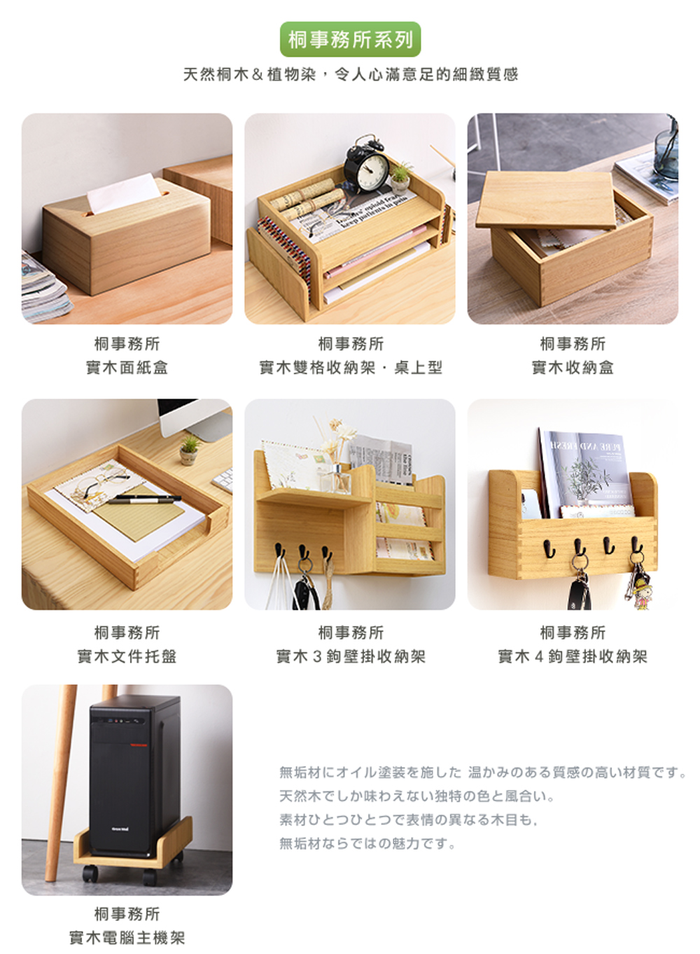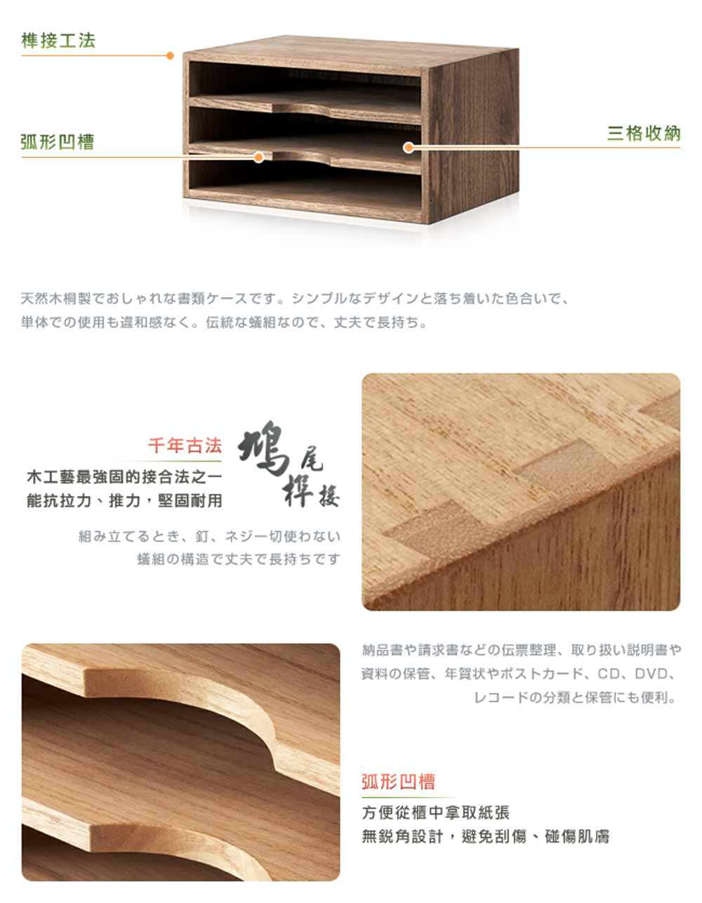 環保植物染不用化學物質,以天然植物油與蠟為基料,滲透進桐木內形成保護層,增添天然木的質感。適用於 A4 文件,擺放報告、書信、帳單、收據等,妥善整理收藏好、不雜亂。弧形凹槽,方便從櫃中拿取紙張。無銳角設計,避免刮傷、碰傷肌膚。隨個人習慣與喜好,文件櫃可直立或橫放,將文件書籍、資料夾等擺放整齊,一切井然有序。