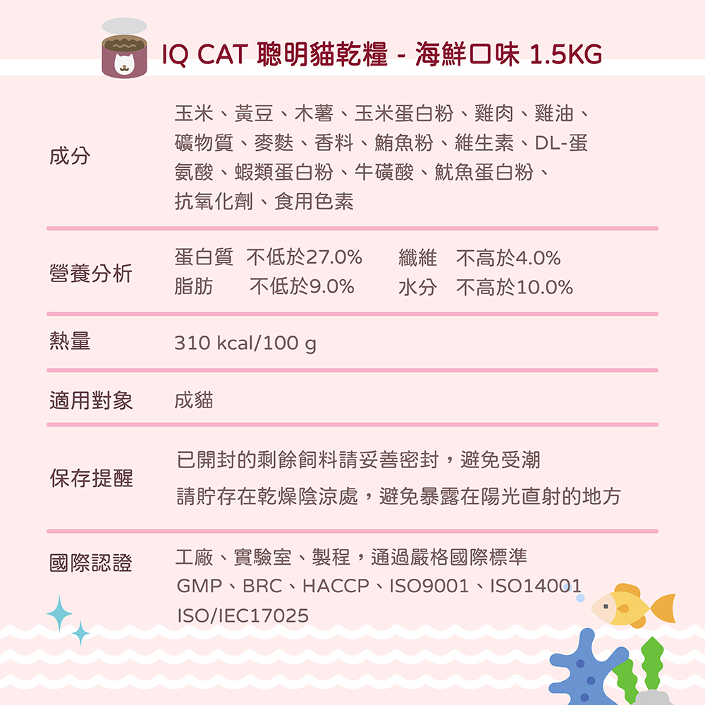 內容物(成分):玉米、黃豆、木薯、玉米蛋白粉、雞肉、雞油、礦物質、麥麩、香料、鮪魚粉、維生素、DL-蛋氨酸、蝦類蛋白粉、牛磺酸、魷魚蛋白粉、 抗氧化劑、食用色素