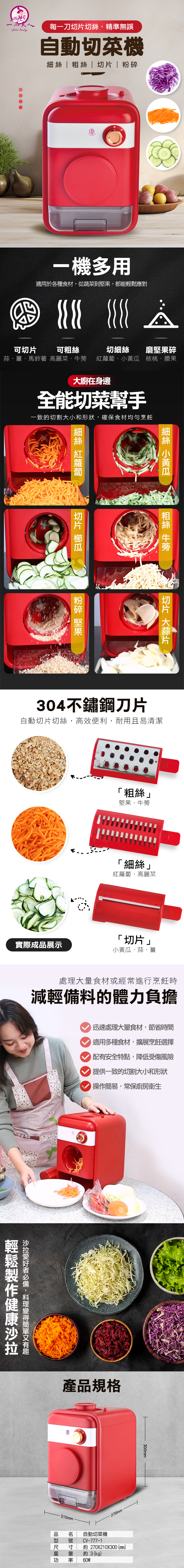 配件:刀片筒×1、切片刀×2、切絲刀(粗)×2、切絲刀(細)×2、壓料桿×1、集菜盒×1、防塵蓋×1、清潔刷×1、說明書×1