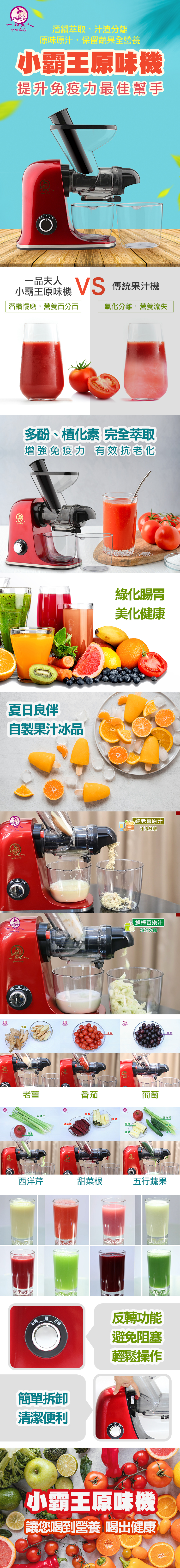 配件:汁渣座*1、汁渣蓋*1、果汁網*1、推磨器*1、果汁杯*1、果渣杯*1、推料桿*1、清潔刷*1
