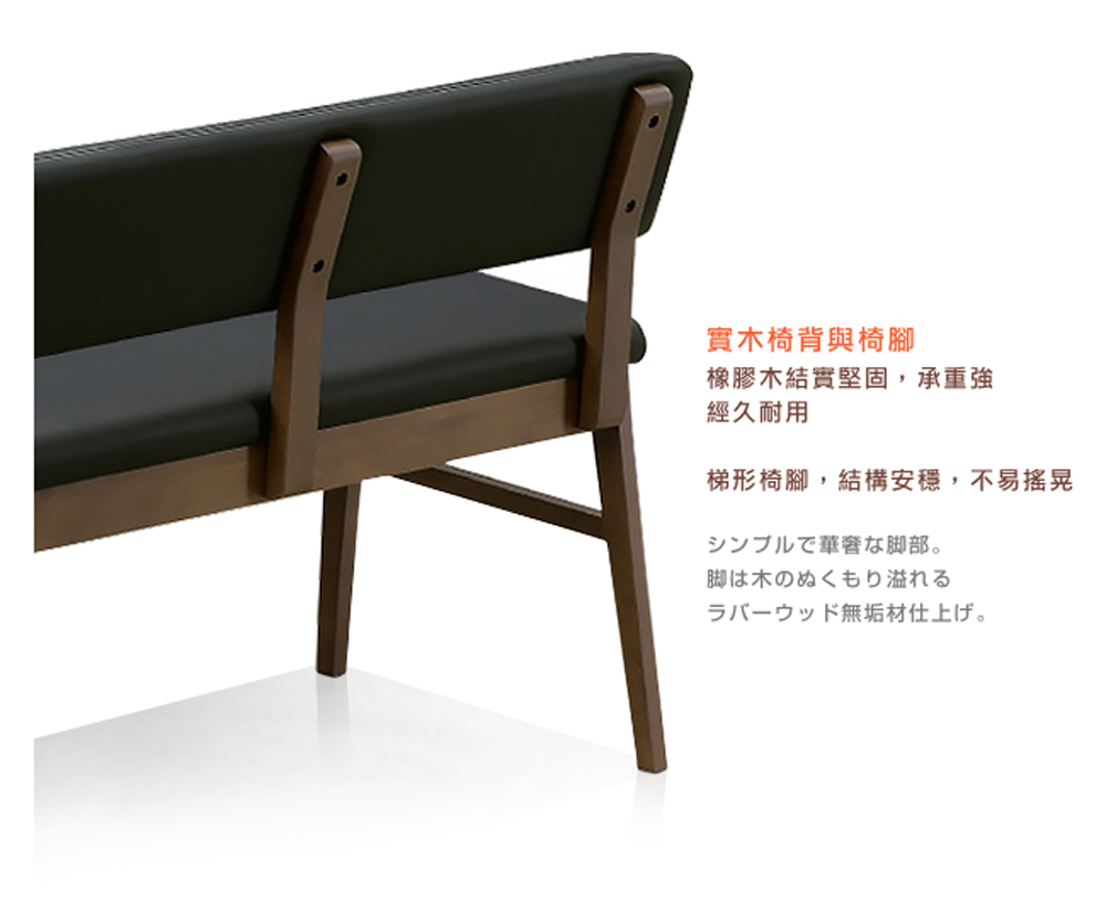 寬敞的座位空間,無拘無束的坐感,少了拘謹、多了自在,讓用餐氣氛放鬆自然。PVC 仿真皮質感,觸感細膩,溫暖居家品味。而防潑水易清潔的特性,不易殘留髒污,讓長凳餐椅保持外觀的乾淨。背墊與坐墊的PU 泡綿,軟硬適中,觸感紮實,適合用餐久坐。橡膠木實木的椅背與椅腳,結實穩固,承重強,經久耐用。梯形椅腳結構安穩,不易搖晃。