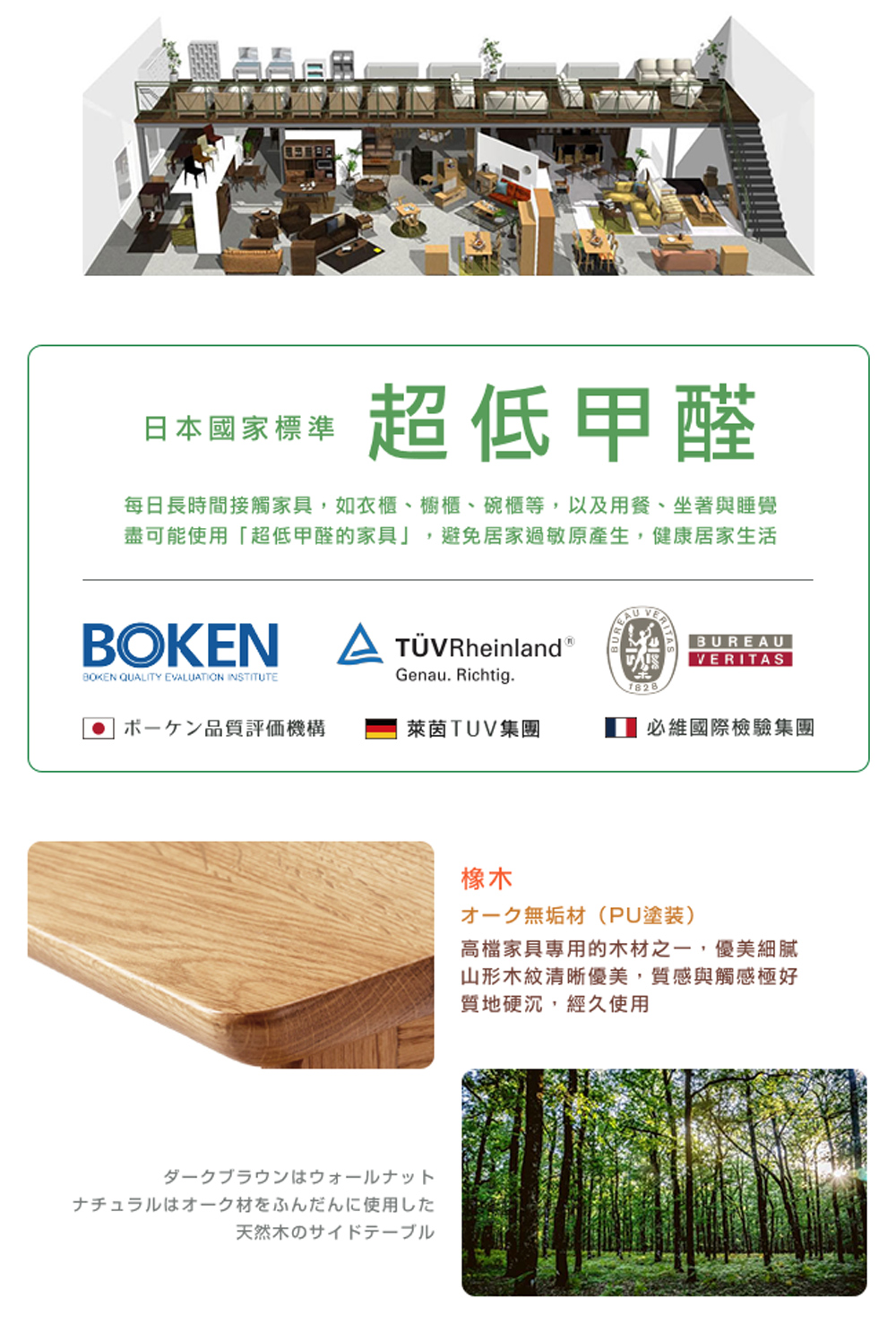 每日長時間接觸家具,如衣櫃、櫥櫃、碗櫃等,以及用餐、坐著與睡覺,盡可能使用「超低甲醛的家具」,避免居家過敏原產生。大丸家具通過日本 BOKEN、德國萊茵 TUV 集團、法國必維國際檢驗集團與多國安全認證,確保每一個家具都是最高品質,符合日本國家標準「超低甲醛」,讓居家環境健康舒適。