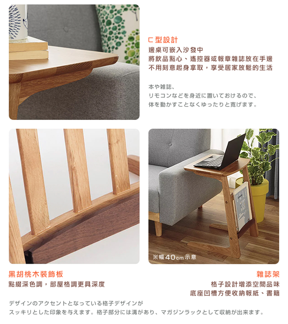 圓潤邊角的天板,整體流暢的造型,帶給居家柔和的感受,而且防碰撞、防刮傷肌膚,安全使用。ㄈ型邊桌可嵌入沙發中,將飲品點心、遙控器或報章雜誌放在手邊,不用刻意起身去拿取,享受居家放鬆的生活。格子設計的雜誌架,增添空間品味。其中的黑胡桃木裝飾板,點綴深色調,格調更具深度。底座凹槽方便收納報紙、書籍。奢華使用橡木為實木腳座,結實穩固,經久耐用。