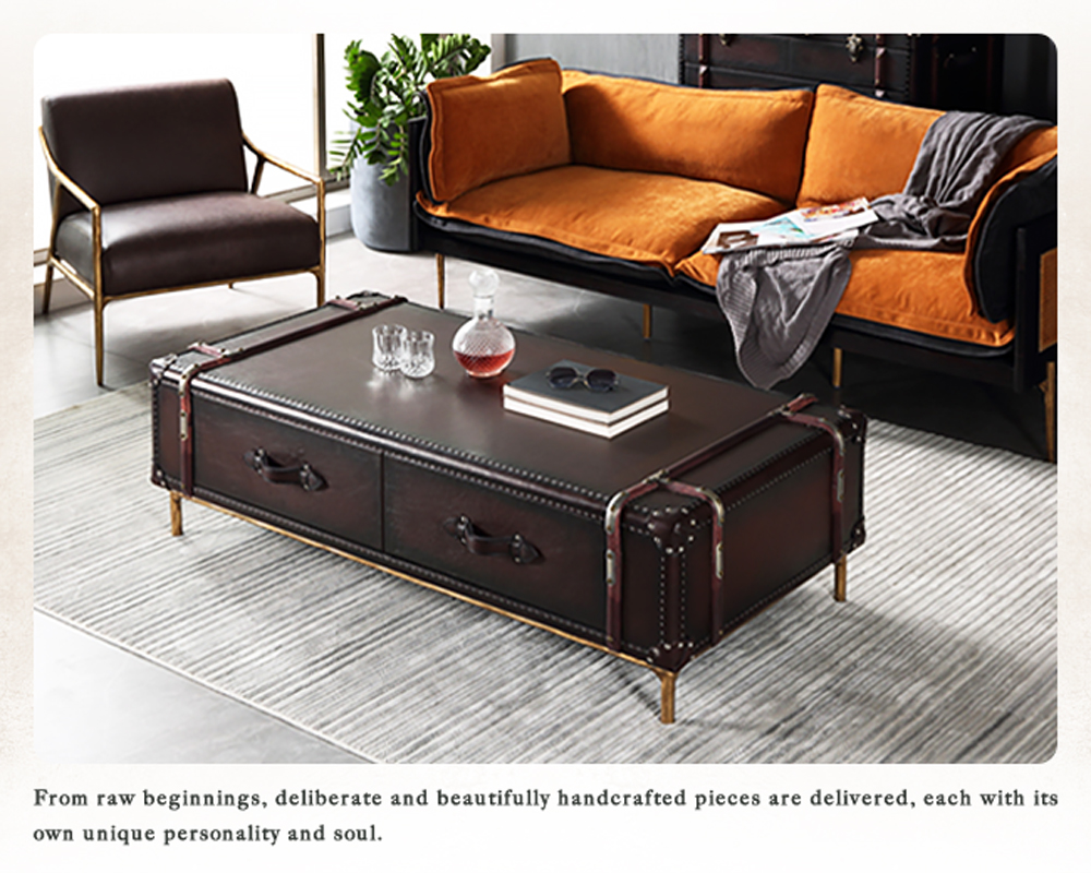 進入屋內,停留在客廳一會,映入眼簾的茶几,向朋友訴說您的品味。穩定沉釀的牛皮,獨樹一幟的實木鉚釘飾邊,展現絕無僅有的個性。奢華的巴西頭層厚牛皮飾邊與把手,呈現厚重、沈穩的印象。專注細節的設計,您選擇的不單單是茶几,而是生活的風格,令人印象深刻或是庸俗,取決在您的格調。手工鍛造金屬桌腳,工匠錘擊實心金屬,不對稱的美感,宛若獨一無二的藝術品,僅此一件。