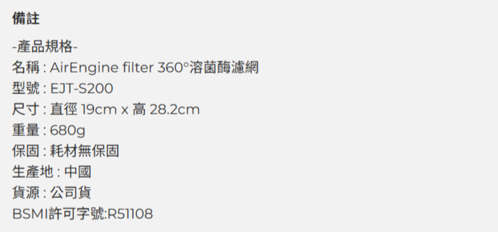 名稱 : AirEngine filter 360°溶菌酶濾網