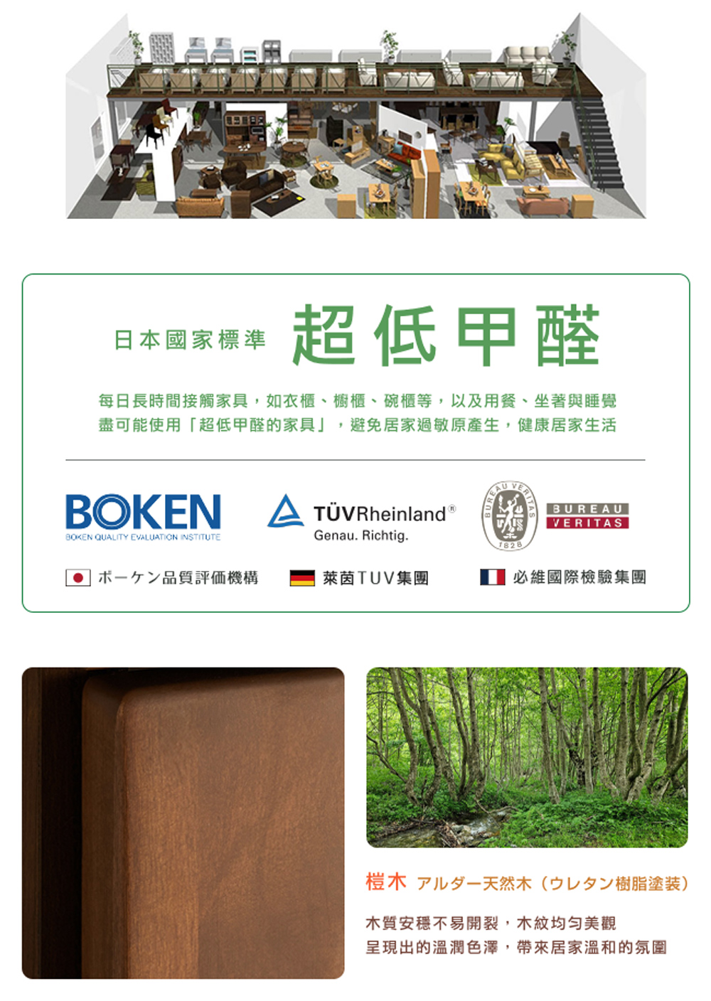 每日長時間接觸家具,如衣櫃、櫥櫃、碗櫃等,以及用餐、坐著與睡覺,盡可能使用「超低甲醛的家具」,避免居家過敏原產生。大丸家具通過日本 BOKEN、德國萊茵 TUV 集團、法國必維國際檢驗集團與多國安全認證,確保每一個家具都是最高品質,符合日本國家標準「超低甲醛」,讓居家環境健康舒適。