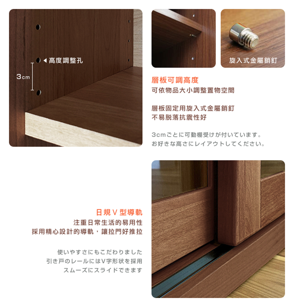 薄型收納櫃與滑門設計,不佔居家空間,美感與實用兼備。玻璃展示櫃讓書籍、杯碟碗盤、公仔藝術品等等一目了然,增添生活的個人風格,不再一成不變。榿木門框,木紋流暢優美,木色柔和溫暖,且實木結構安穩耐用。滑門之間的門縫毛刷條,降低灰塵飄入。8 個可調層板,依物品大小調整置物空間。注重日常生活的易用性,使用日規V型導軌,拉門好推拉。