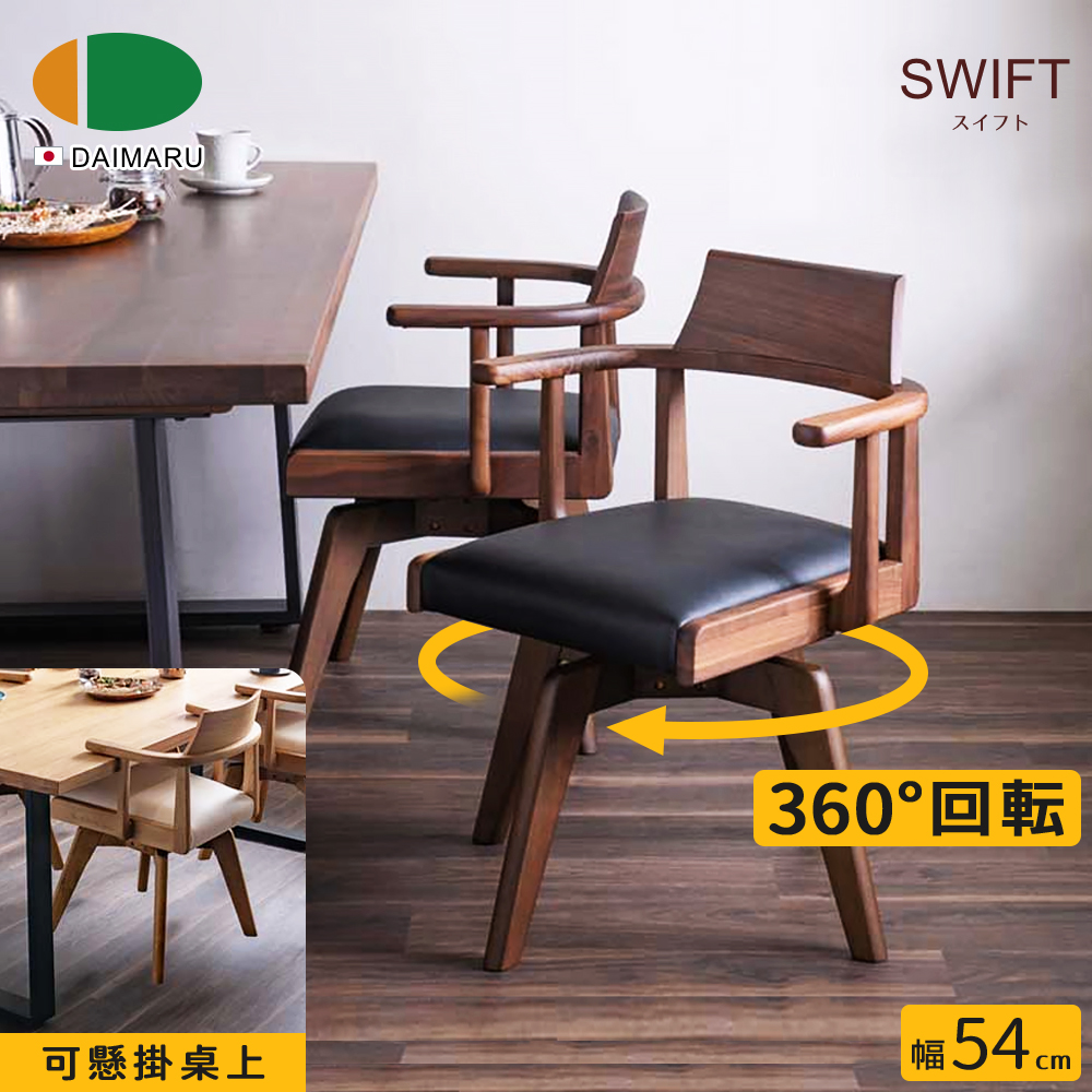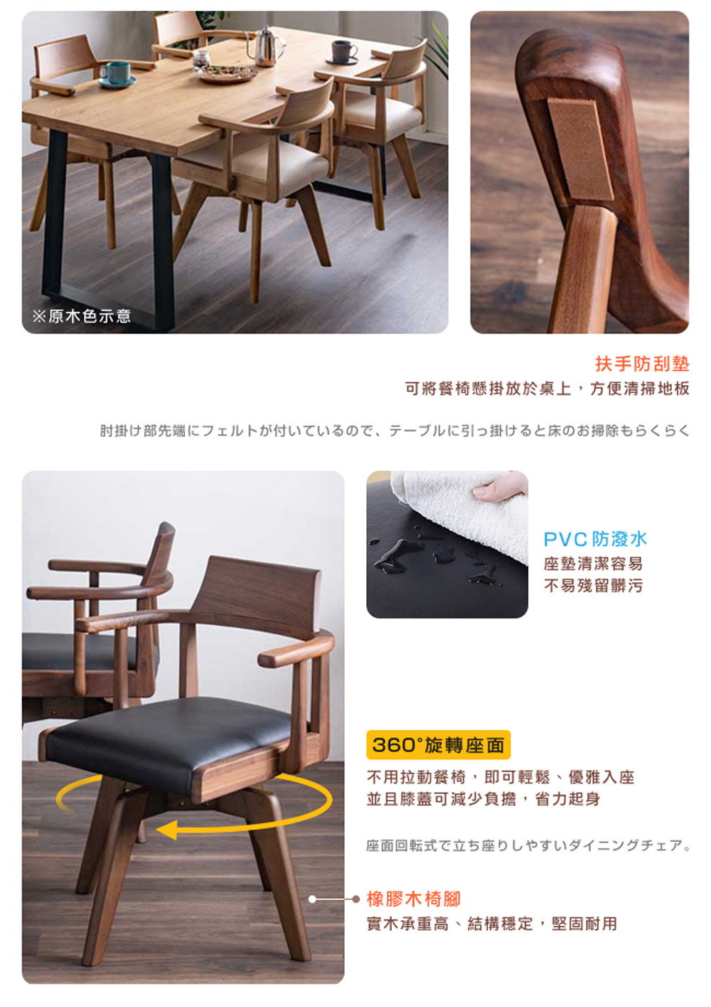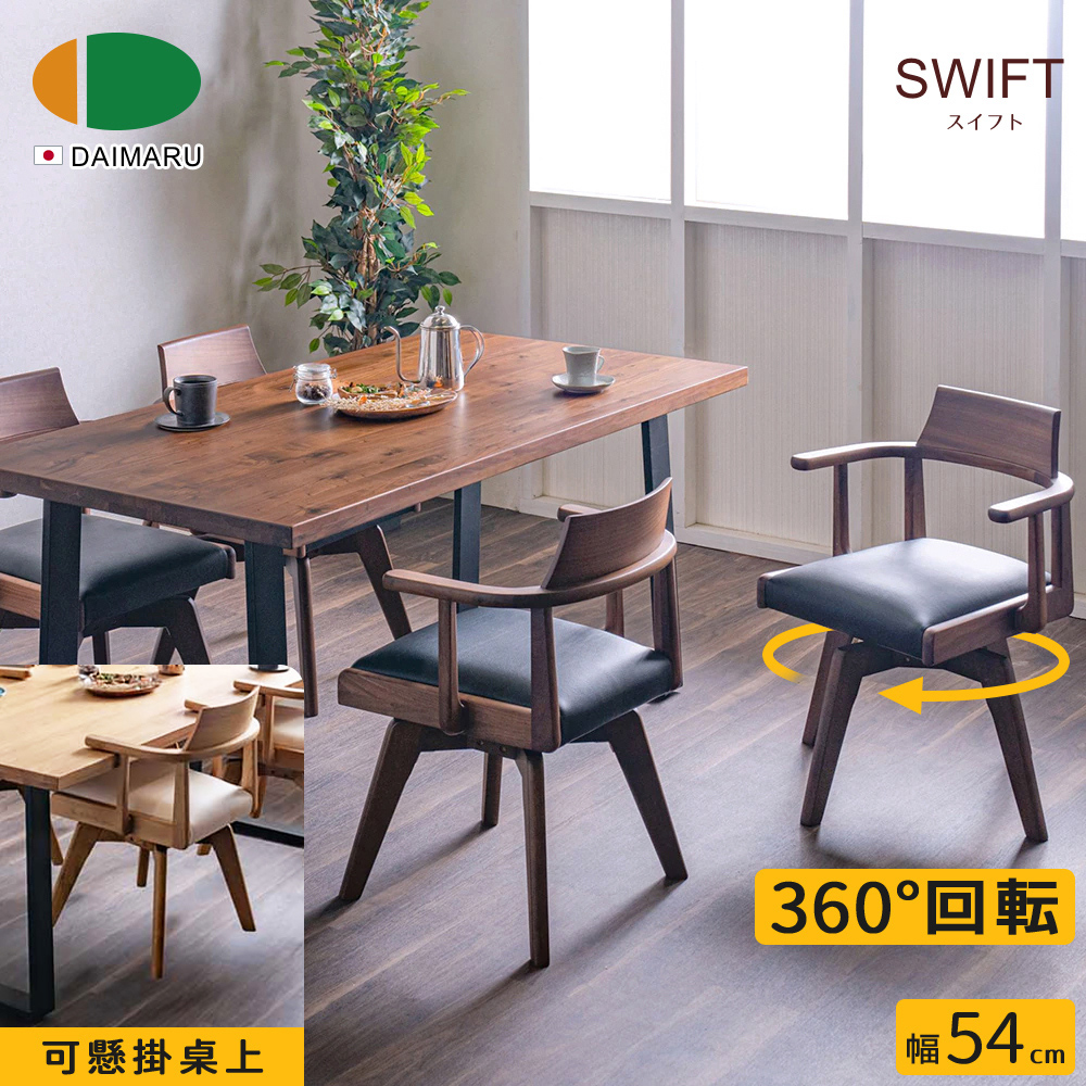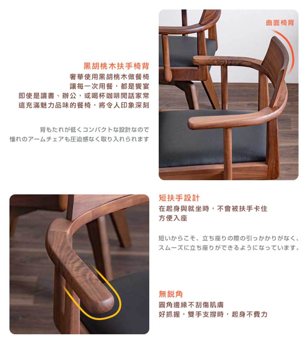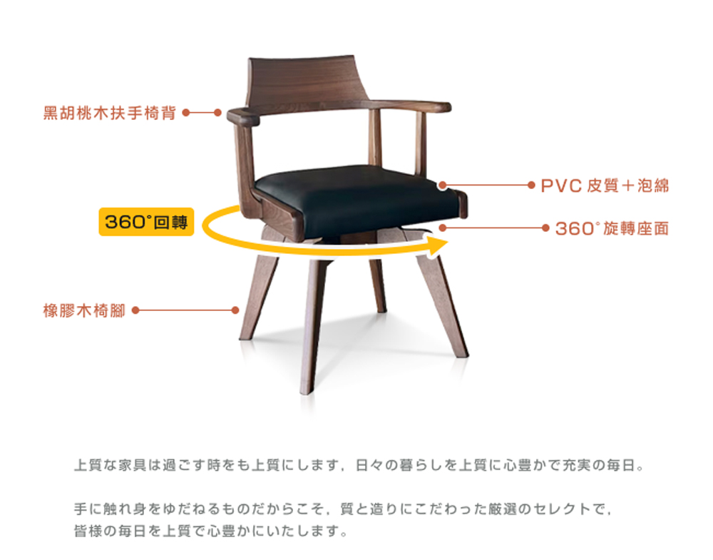 名列世界屈指可數的銘木黑胡桃木,擁有獨一無二的質感「墨流木紋」,沈穩的色調醞釀出高貴不凡的厚實感,質地硬沉,讓每一次用餐,都是饗宴。即使是讀書、辦公,或喝杯咖啡閒話家常,這充滿魅力品味的餐椅,將令人印象深刻。短扶手設計與 360° 旋轉座面,不用拉動餐椅,即可輕鬆、優雅入座,並且膝蓋可減少負擔,省力起身。扶手防刮墊,可將餐椅懸掛放於桌上,方便清掃地板。PVC 防潑水,座墊清潔容易,不易殘留髒污。橡膠木椅腳,實木承重高、結構穩定,堅固耐用。