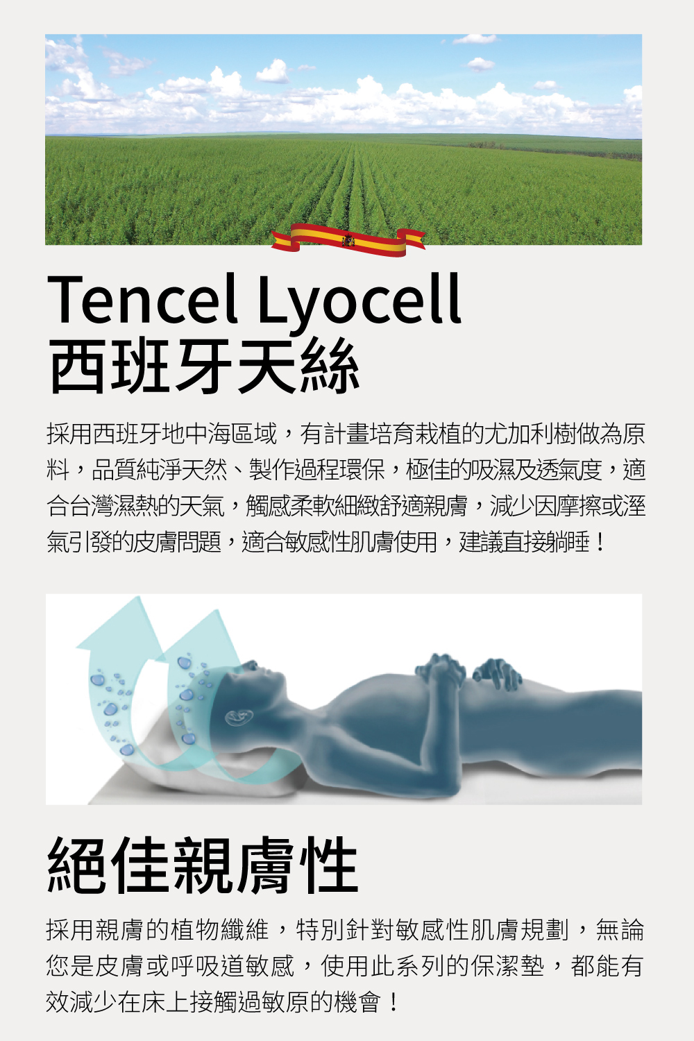 內容物: 西班牙枕頭保潔墊(一組兩入)、全密封床墊套(乙入) 顏色:白 內層:100%聚氨酯 床墊套表層:100%聚酯纖維 枕套表層:100%Tencel Lyocell 床墊套尺寸:特大32 — 6x7尺 / 182x210x32cm(適用床墊高度30~36cm) 枕套尺寸:50x75cm 原產地(國):美國研發設計 / 中國加工製造