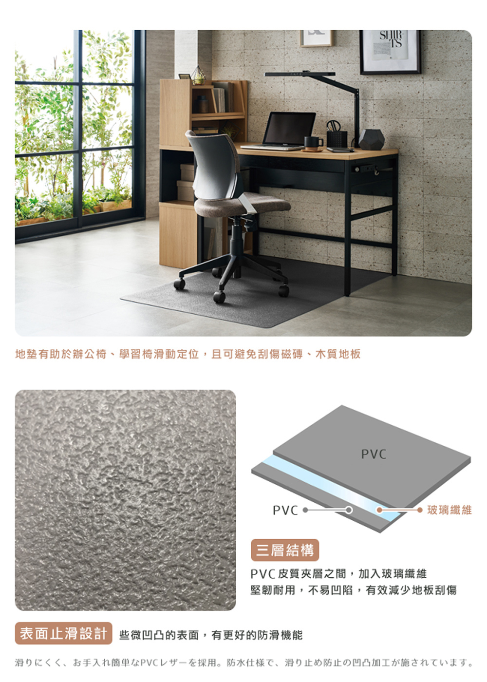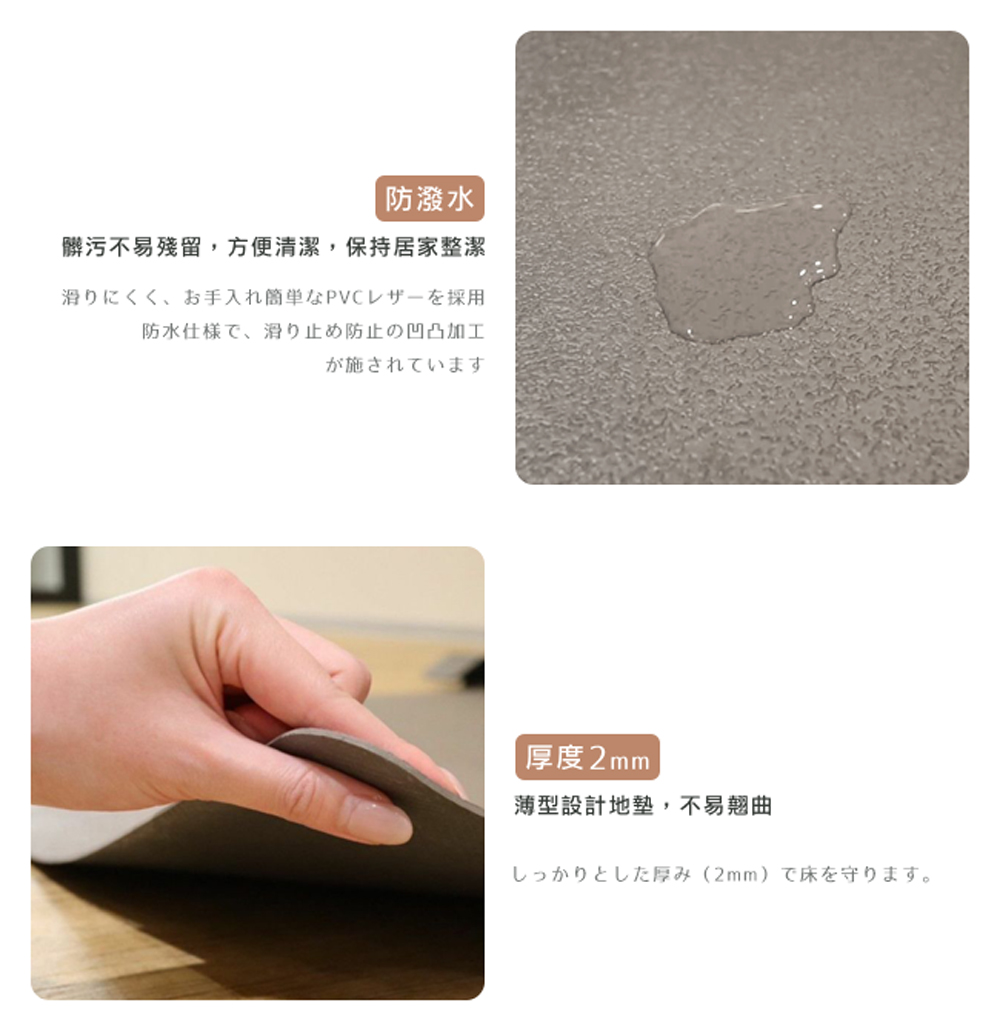 地墊的 PVC 皮質夾層之間,加入玻璃纖維,堅韌耐用,不易凹陷,有效減少地板刮傷。些微凹凸的表面設計,有更好的防滑機能。防潑水,髒污不易殘留,方便清潔,保持居家清潔。厚度 2mm 薄型地墊,不易翹曲。