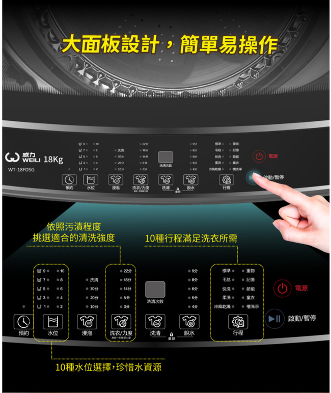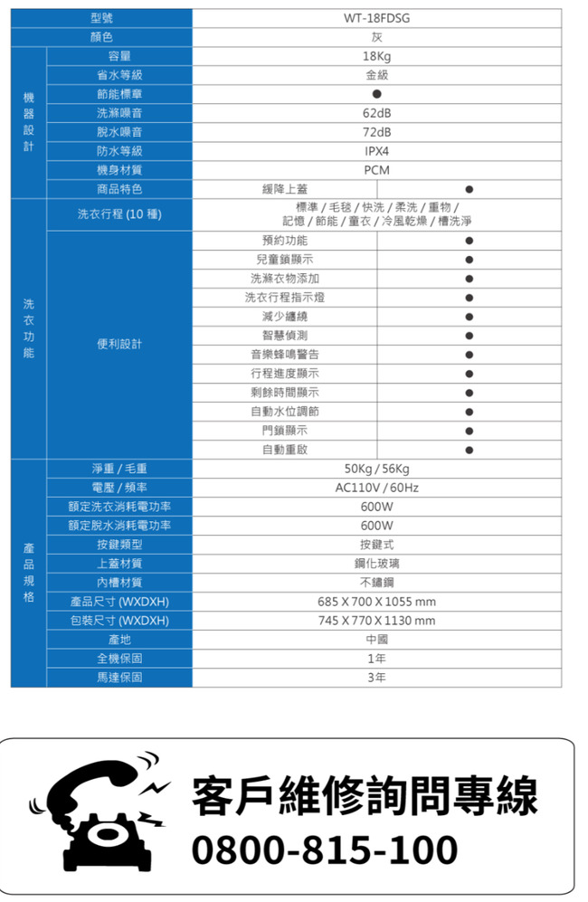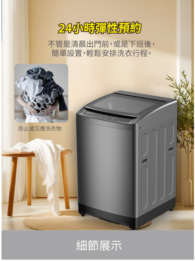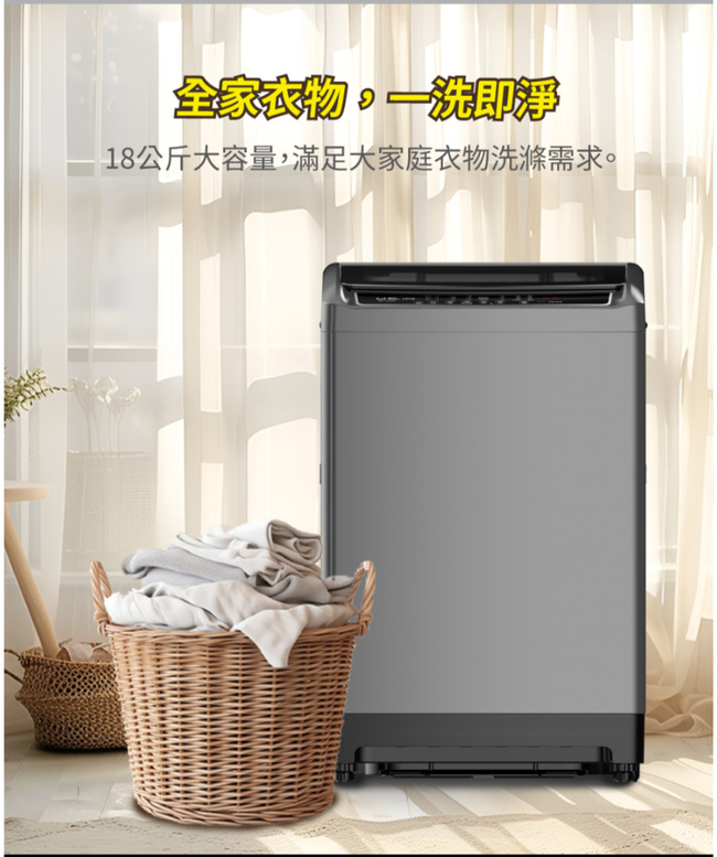 18公斤大容量 24HR彈性預約洗衣行程 全機一年保固
