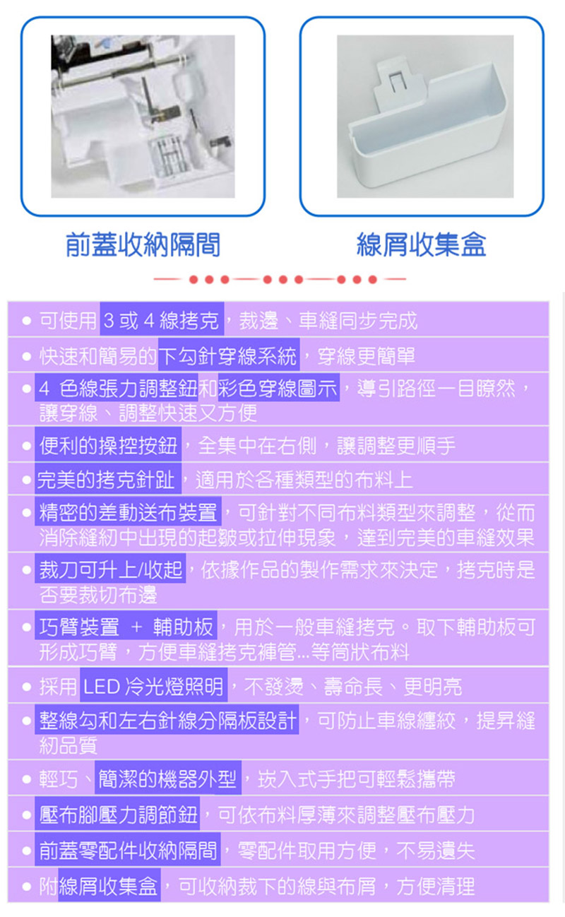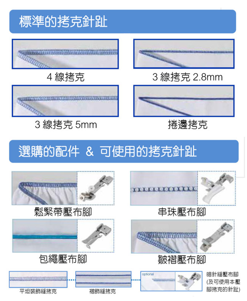 針趾長度調整:0.8 - 4.0mm,可車縫密拷克