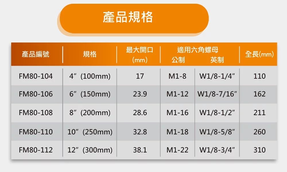 尺寸:8吋(200mm)最大開口:28.6mm材質:鉻釩鋼產地:台灣