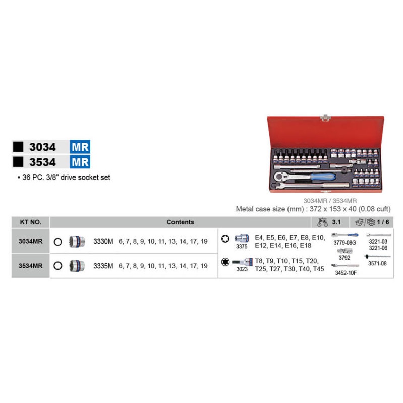 36件式3/8吋套筒扳手組,適用各種維修裝配工作。