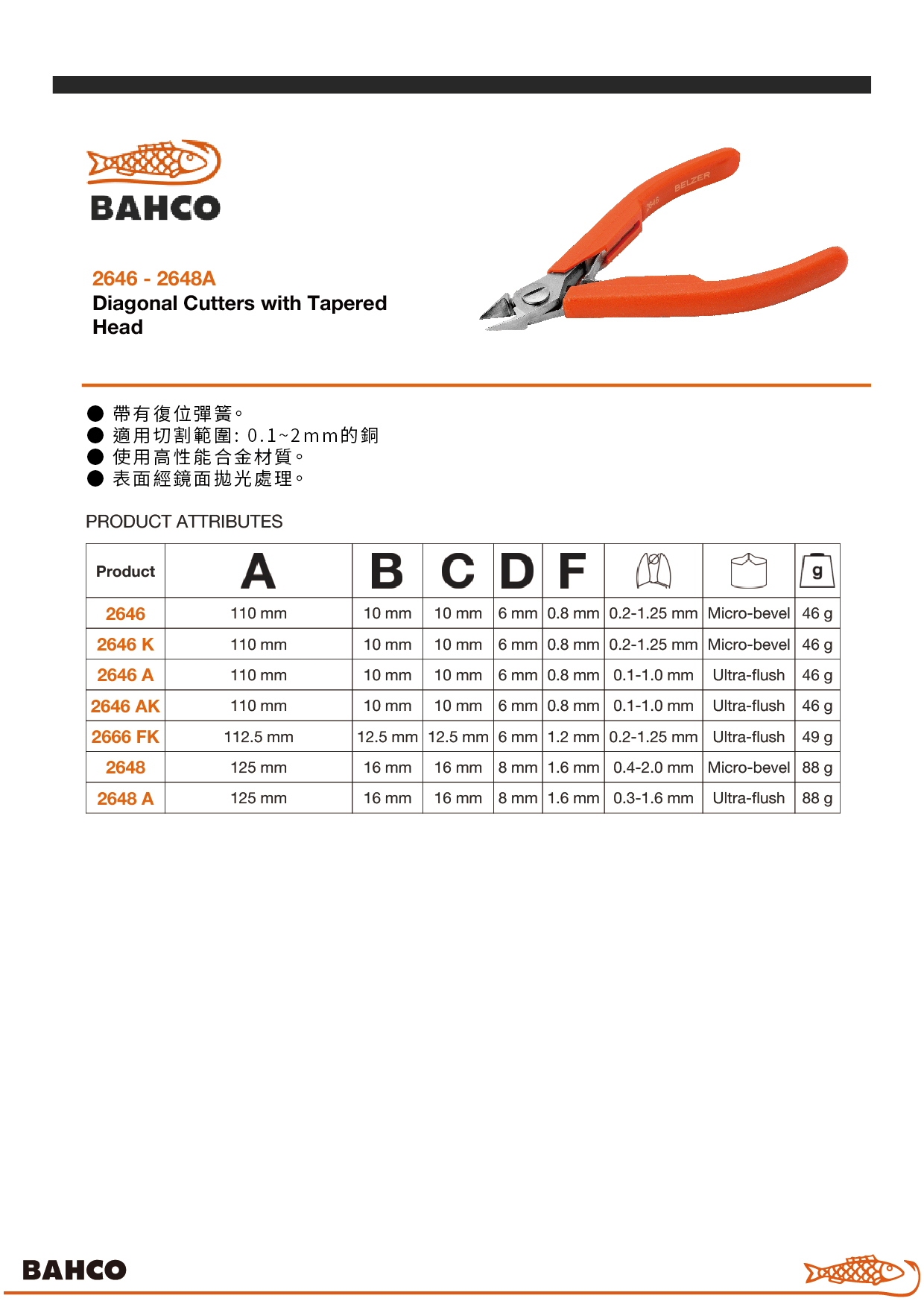 BAHCO】錐形頭微型電子斜口鉗 (極齊平切口, 防殘屑彈跳設計) 0.2-1.25mm(無)