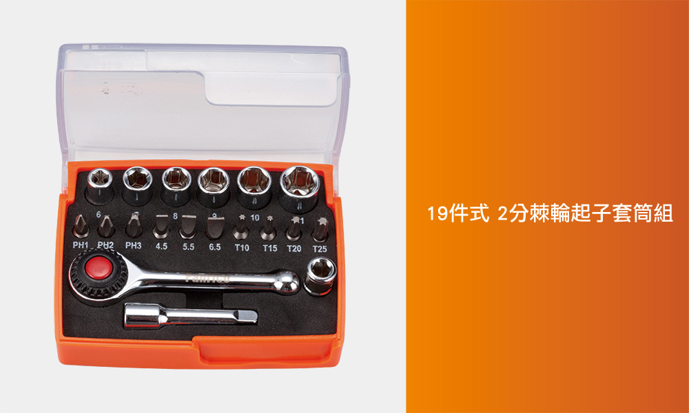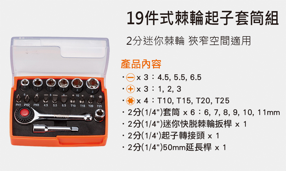 一字起子頭x 3:4.5, 5.5, 6.5十字起子頭x 3:1, 2, 3星型起子頭x 4:T10, T15, T20, T252分(1/4吋)套筒6支:6, 7, 8, 9, 10, 11mm2分(1/4吋)迷你快脫棘輪扳桿1支2分(1/4吋)起子轉接頭2分(1/4吋)50mm延長桿