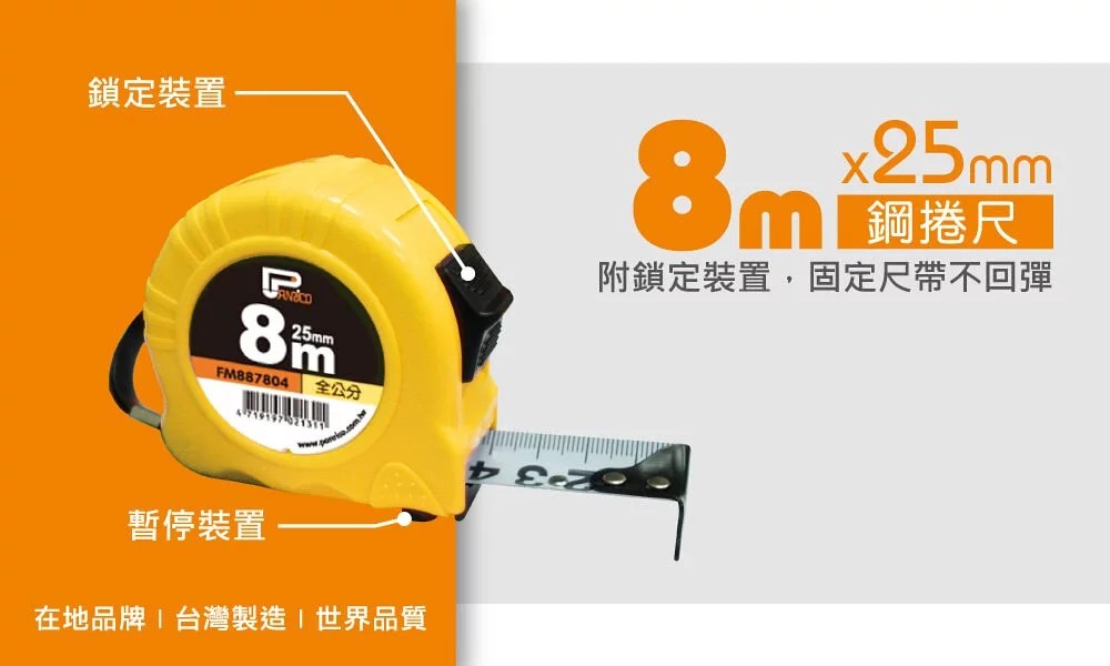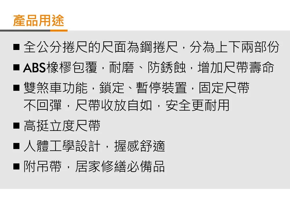 尺面為鋼捲尺雙煞車功能,鎖定、暫停裝置高挺立度尺帶