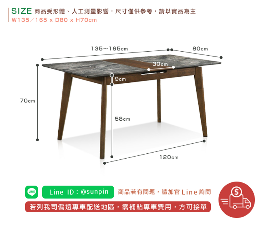 免自行組裝,專人送貨到府 產品尺寸:W135/165*D80*H70 cm 外箱尺寸:W137*D82*H72 cm 淨重:35 kg 毛重:40 kg 材質:HPL 高壓層壓板桌面、橡膠木桌腳 顏色:深棕 進口國:日本原裝進口 產地:越南