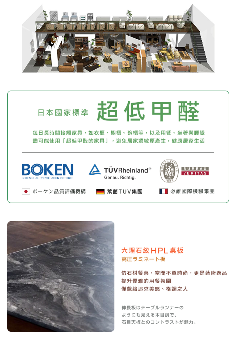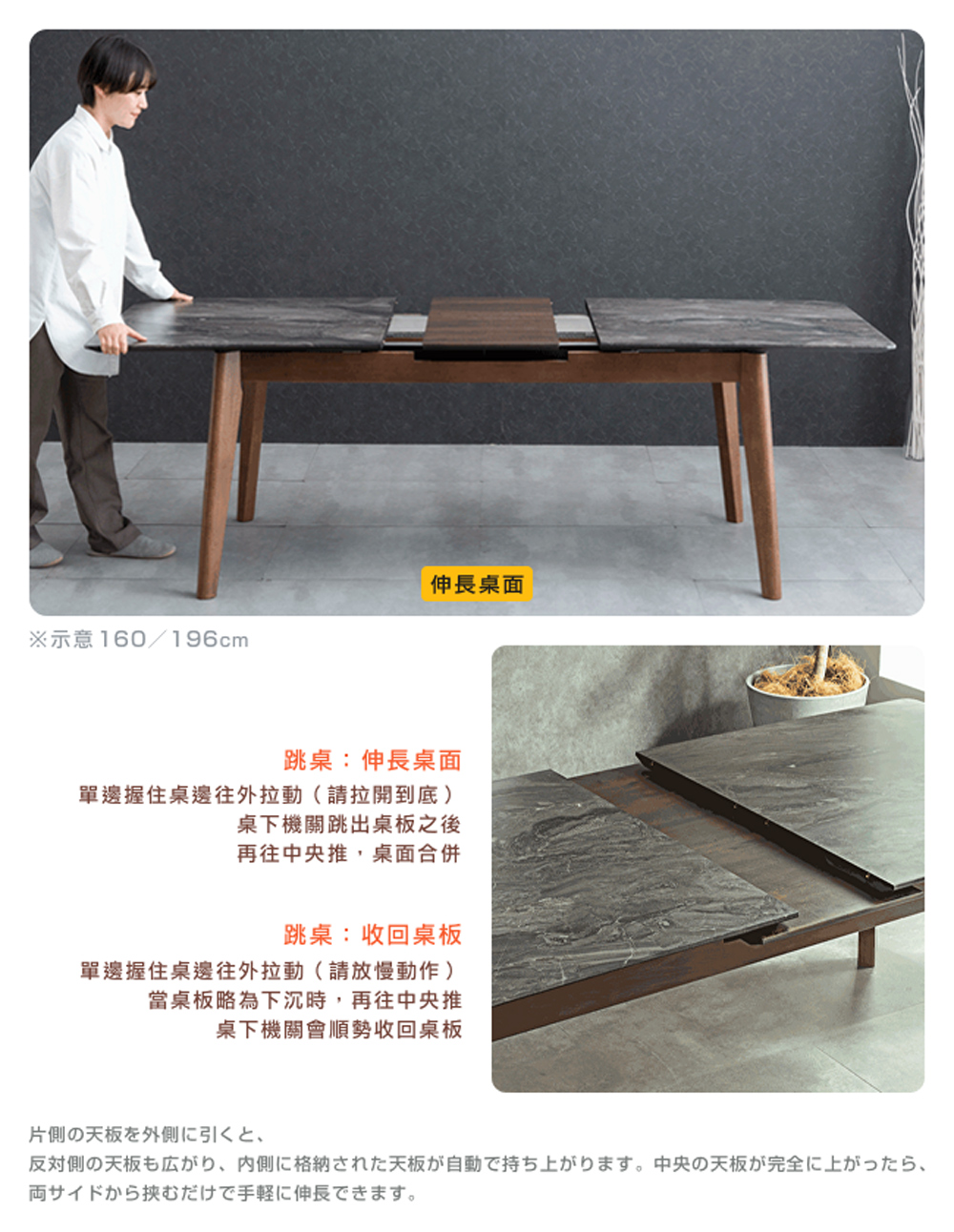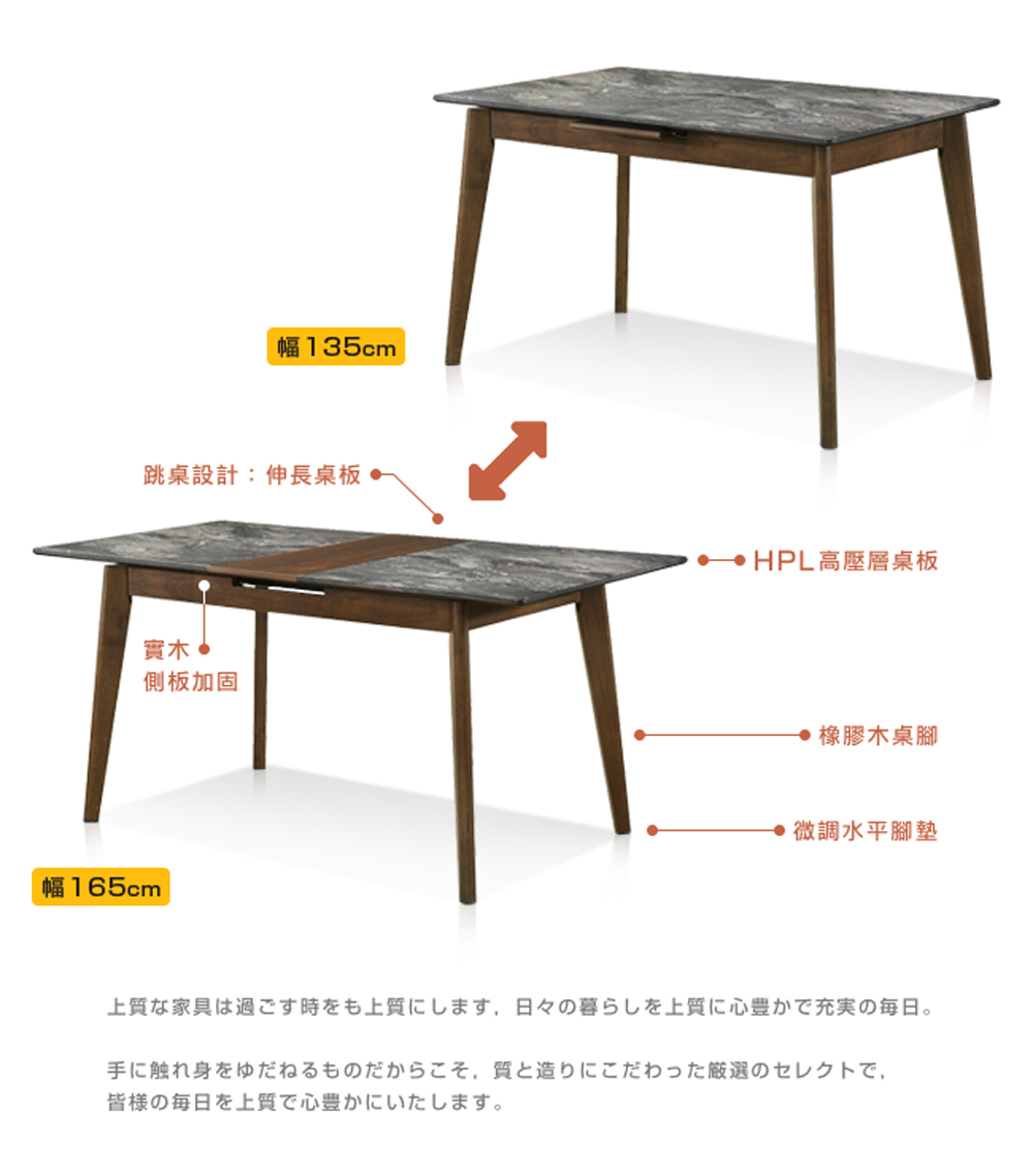 跳桌拉合設計:伸長天板 可切換桌長:135/165cm 高壓HPL桌板,抗磨耐熱