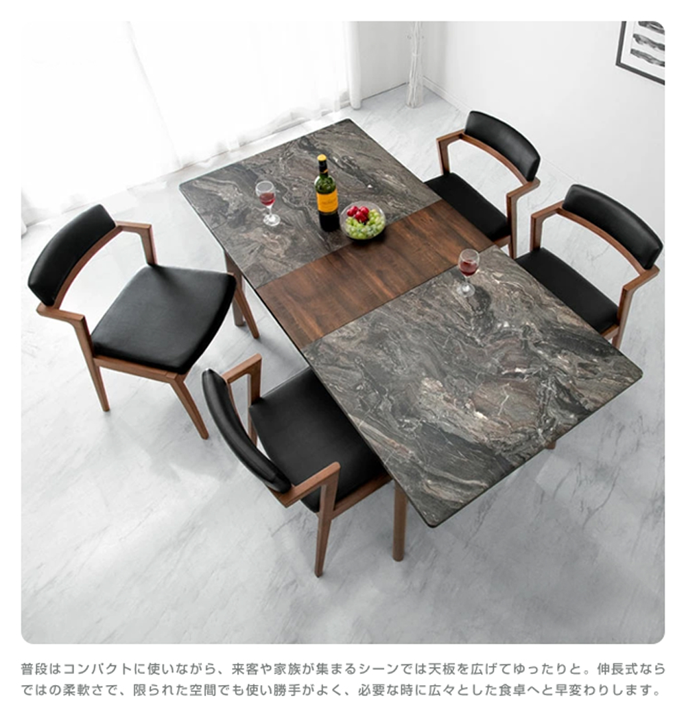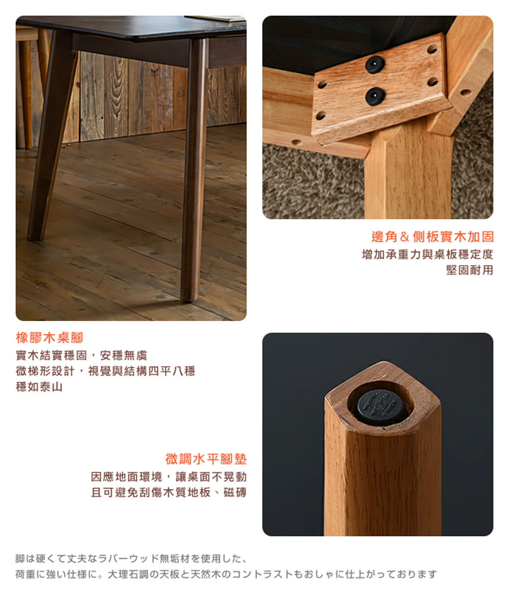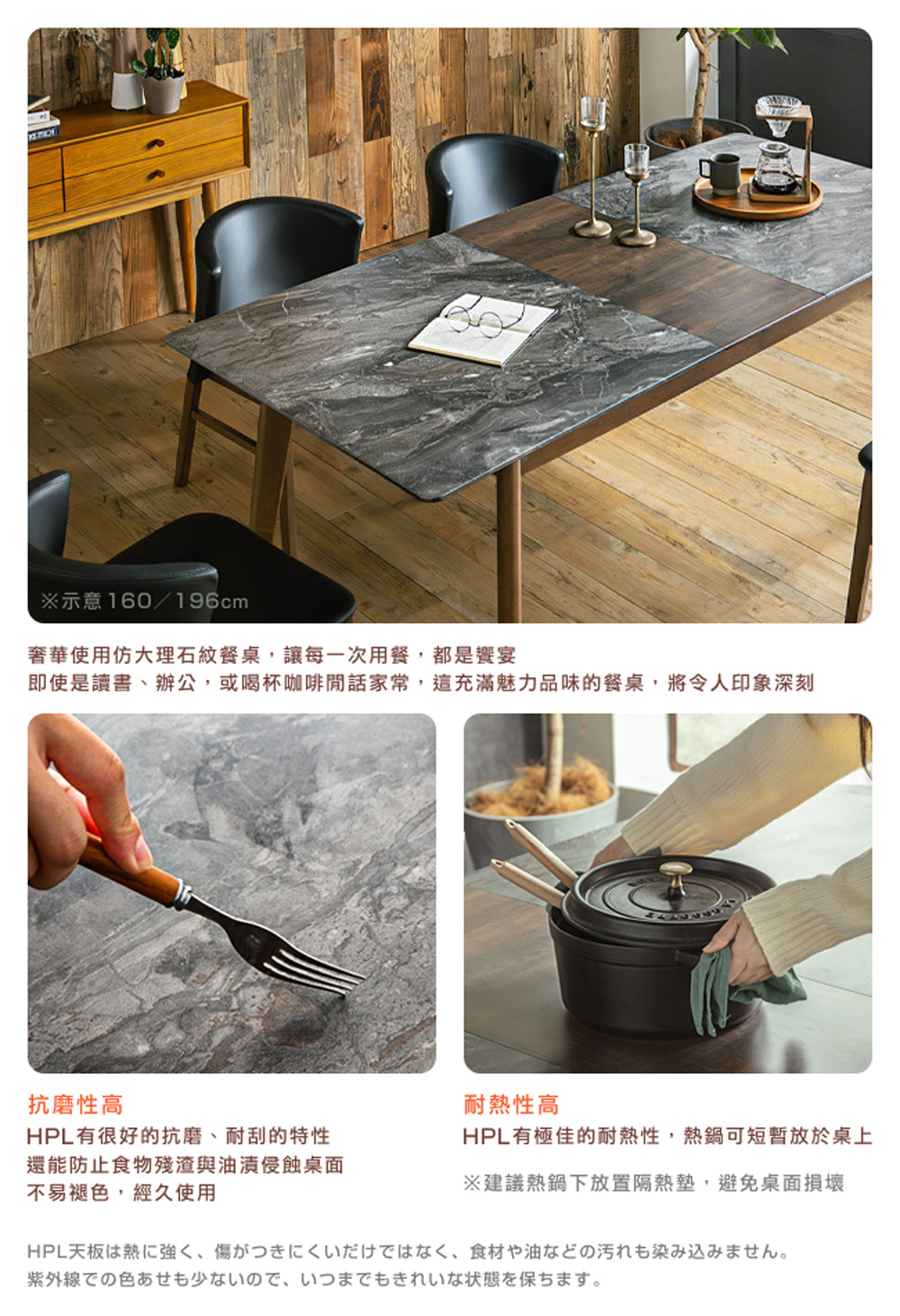 奢華使用仿大理石紋餐桌,讓每一次用餐,都是饗宴。即使是讀書、辦公,或喝杯咖啡閒話家常,這充滿魅力品味的餐桌,將令人印象深刻。HPL 高壓層壓板桌面,有很好的抗磨、耐刮的特性,還能防止食物殘渣與油漬侵蝕桌面,不易褪色,經久使用。極佳的耐熱性,熱鍋可短暫放於桌上。單邊握住桌邊往外拉動,即可伸長桌面,增加用餐空間。邊角&側板實木加固,增加承重力與桌板穩定度,堅固耐用。橡膠木桌腳,實木結實穩固,安穩無虞。微梯形設計,視覺與結構四平八穩,穩如泰山。因應地面環境,微調水平腳墊,讓桌面不晃動,且可避免刮傷木質地板、磁磚。