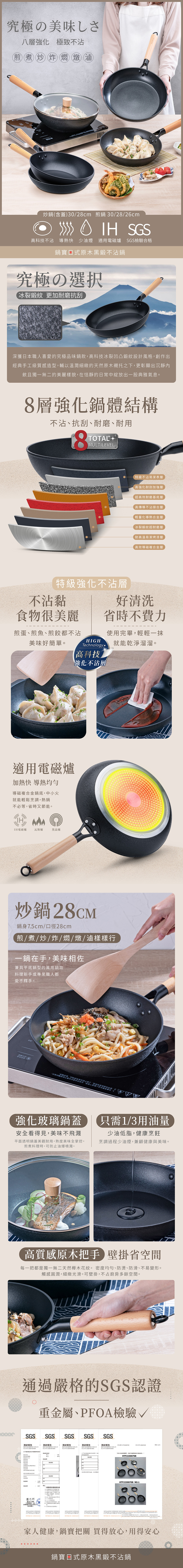 | 商品說明 | 導磁複合金鍋底,輔助熱力均勻擴散,適用電磁爐 只需1/3用油量,冷鍋冷油輕鬆烹調享健康 玻璃鍋蓋密封性佳,可隨時掌控食物狀況 高質感天然櫸木把手,好拿好握不滑手 |