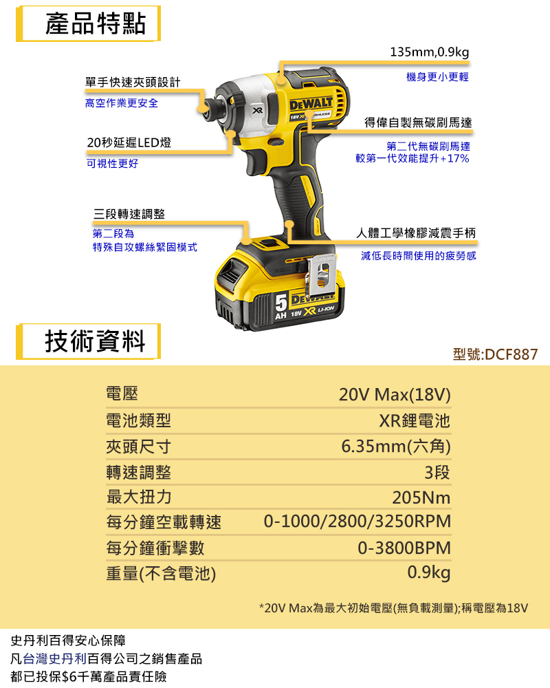 ● 可搭配得偉18V系列 1.3/1.5/2.0/3.0/4.0/5.0Ah電池