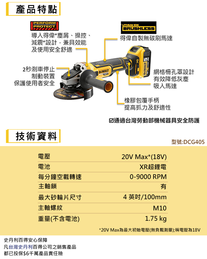 美國 得偉 DEWALT 18V(20Vmax) XR無碳刷砂輪機 (側滑式開關) DCG405N