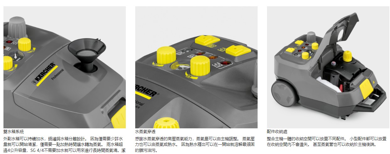 鍋爐容量 (l):2.4 水槽容量(公升) (l):2 蒸氣壓力 (bar):4 加熱功率:1500 加熱時間:9 鍋爐溫度:145 電線長度(公尺):3 電壓(伏特):100 頻率(赫茲):50 - 60 不含配件的重量(公斤):8 蒸氣清洗機SG 4/4