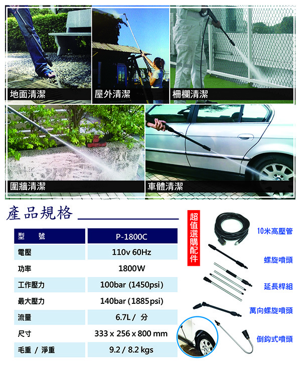 ◆適用範圍:地面清潔、屋外清潔、柵欄清潔、圍牆清潔與車體清潔......等等。