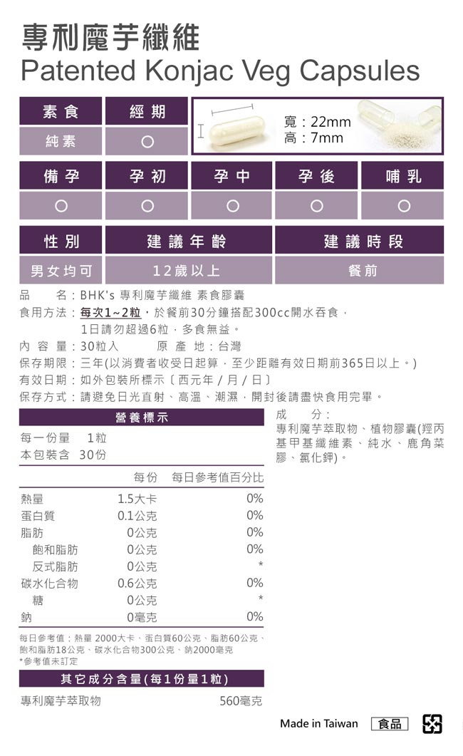 商品名稱:BHK’s─專利魔芋纖維 膠囊食品