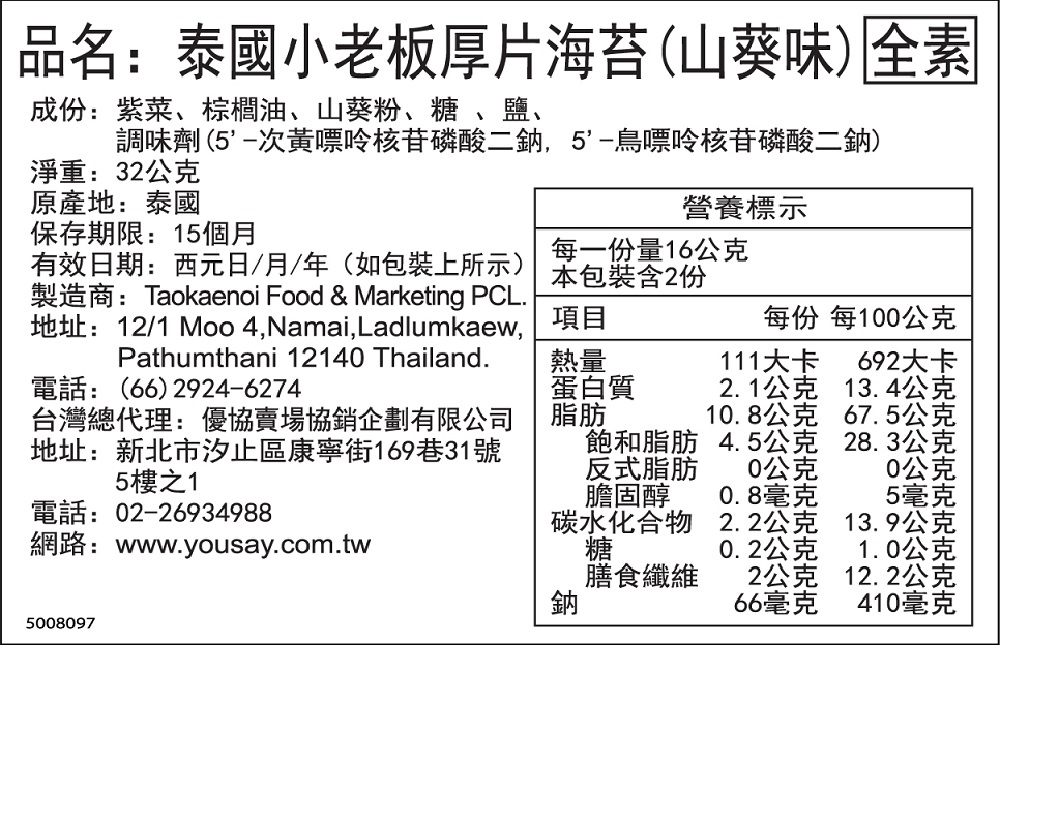 商品組合/規格:每包 32g 商品重(容)量:32g 內容物名稱(成分):紫菜、精製混合油{棕櫚油[棕櫚油、抗氧化劑(二丁基羥基甲苯)]、米糠油}、山葵味調味料{糖、碘鹽(鹽、碘酸鉀)、麥芽糊精、山葵香料粉(辛烯基丁二酸鈉澱粉、山葵香料、麥芽糊精、脂肪酸甘油酯)、葡萄糖、調味劑:(5’-次黃嘌呤核苷磷酸二鈉、5’-鳥嘌呤核苷磷酸二鈉)、酵母萃取粉、水解蛋白(大豆、玉米、小麥)、品質改良劑(矽鋁酸鈉)、芥子油} 食品添加物名稱:本產品含大豆、麩質穀物類及芥末製品 保存期限:15個月 原產地(國):泰國 製造廠商或國內負責廠商名稱:優協賣場協銷企劃有限公司 商品來源:泰國 製造廠商或國內負責廠商地址:優協賣場協銷企劃有限公司 製造廠商或國內負責廠商電話:(02)2693-4988 食品業者登錄字號:F-180267584-00000-3 投保產品責任險字號:富邦產物保險0525字第23AML0004180號 零稅商品需特別註記: 有含豬肉之商品需有豬肉產地:無 日本產商品需要細項"縣"資料: 營養標示:紫菜、精製混合油{棕櫚油[棕櫚油、抗氧化劑(二丁基羥基甲苯)]、米糠油}、山葵味調味料{糖、碘鹽(鹽、碘酸鉀)、麥芽糊精、山葵香料粉(辛烯基丁二酸鈉澱粉、山葵香料、麥芽糊精、脂肪酸甘油酯)、葡萄糖、調味劑:(5’-次黃嘌呤核苷磷酸二鈉、5’-鳥嘌呤核苷磷酸二鈉)、酵母萃取粉、水解蛋白(大豆、玉米、小麥)、品質改良劑(矽鋁酸鈉)、芥子油}◎ 製造日期與有效期限,商品成分皆標示於包裝盒上 ◎ 本產品網頁因拍攝關係,圖檔略有差異,實際以廠商出貨為主 ◎ 本產品文案若有變動敬請參照實際商品為準 ◎ 以消費者收受日算起,至少距有效日期前【30】日以上:依商品包裝標示,若收到小於30天可聯絡客服供退換貨