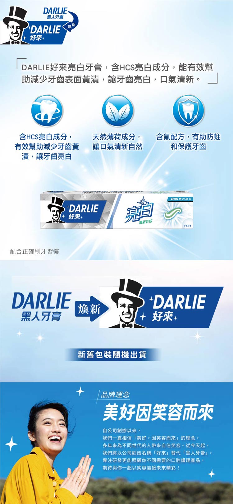 | 產品特色 | 含 HCS 亮白成分 能深觸牙齒表面不平滑處,幫助將食物殘渣及牙齒黃漬有效去除,溫和不傷琺瑯質 實驗證明,能有效幫助減少牙齒黃漬,讓牙齒亮白 清新薄荷好口氣 含氟配方幫助防蛀 |