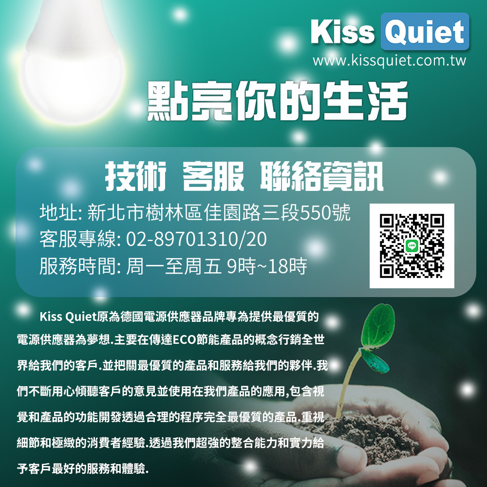 Kiss Quiet原為德國電源供應器品牌專為提供最優質的電源供應器為夢想.主要在傳達ECO節能產品的概念行銷全世界給我們的客戶.並把關最優質的產品和服務 給我們的夥伴.我們不斷用心傾聽客戶的意見並使用在我們產品的應用,包含視覺和產品的功能開發透過合理的程序完全最優質的產品.重視細節和極致的消費者經 驗.透過我們超強的整合能力和實力給予客戶最好的服務和體驗.Kiss Quiet的團隊在2014年夾帶強大的研發實力全新投入LED照明產品的製造和研發.希望在PC產品的堅強基礎下為地球的節能環保做出更好的產品為企業使命.