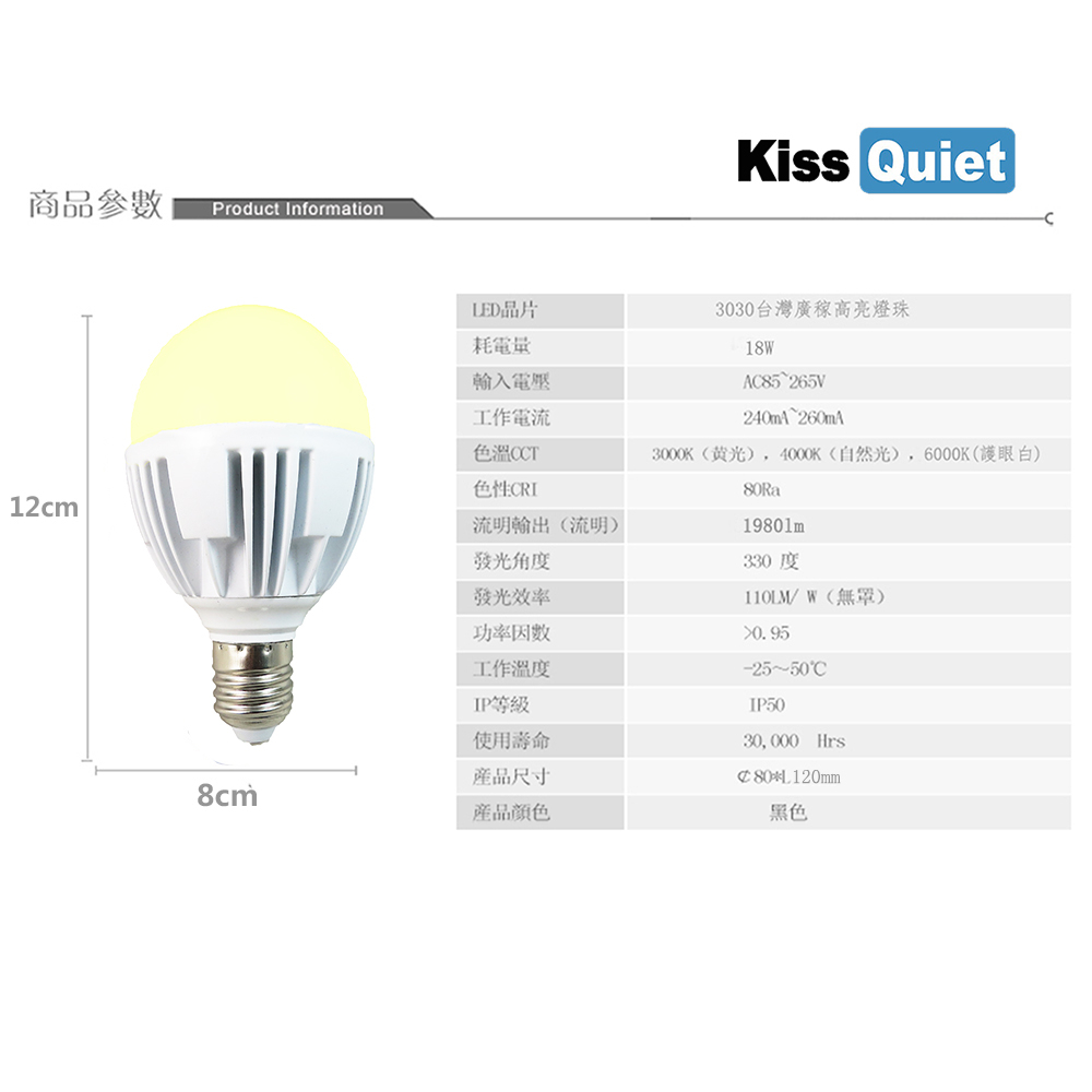 【Kiss Quiet】2年保固 18W(護眼白6000K/自然光4000K/3000K黃光) 330度廣角型LED燈泡(10入)