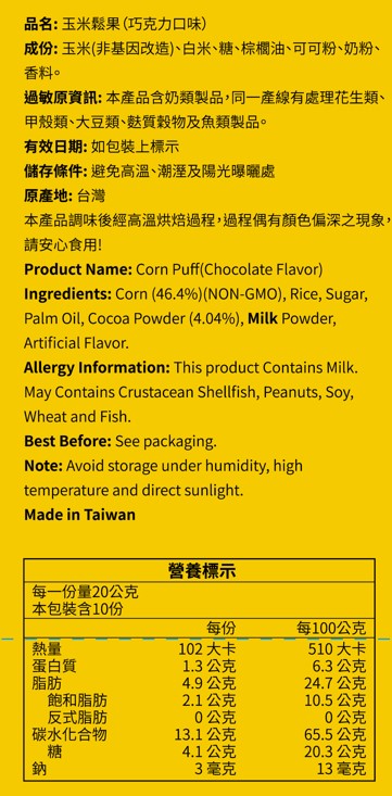 內容物名稱(成分):玉米(非基因改造)、白米、糖、棕櫚油、可可粉、奶粉、香料