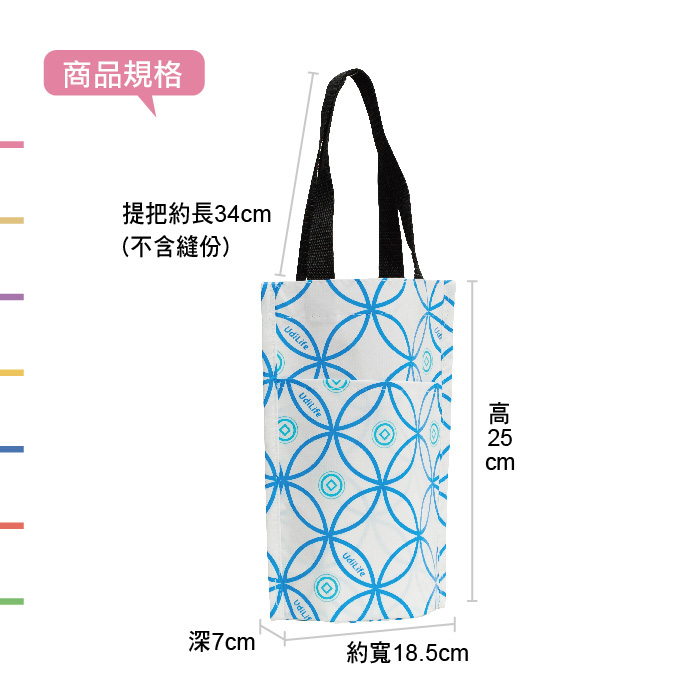 商品成分:本體/RPET麗新布(70克)+啞光膜;提把/Polyester聚酯纖維 提把/約長34cm(不含縫份)