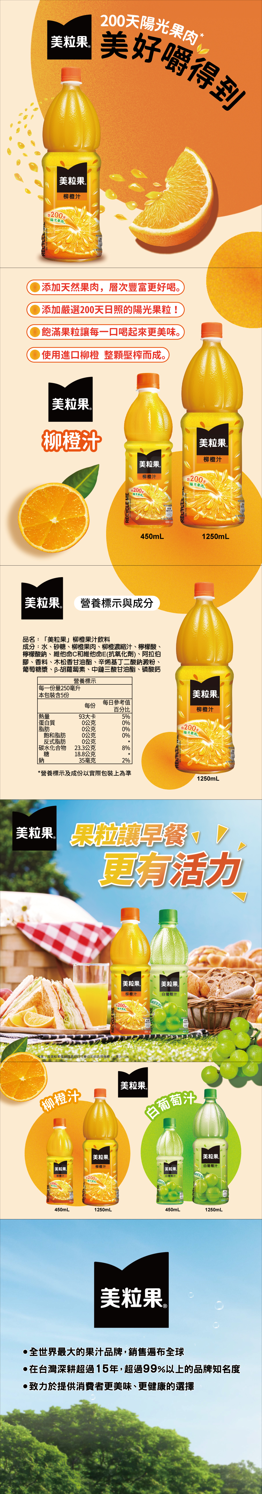 主要成份:水、砂糖、柳橙果肉、柳橙濃縮汁、檸檬酸、檸檬酸鈉、維他命C和維他命E(抗氧化劑)、阿拉伯膠、香料、木松香甘油酯、辛烯基丁二酸鈉澱粉、葡萄糖漿、β-胡蘿蔔素、中鏈三酸甘油脂、磷酸鈣
