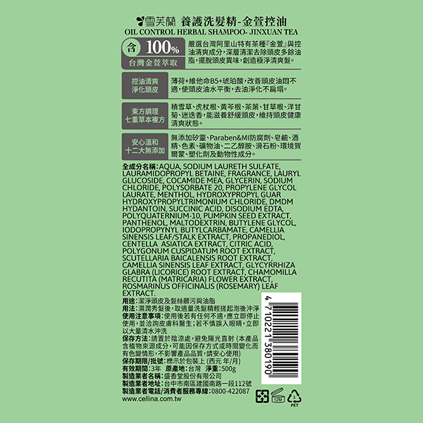 品牌:雪芙蘭 - 規格:500g - 保存期限:1095天 - 有效期限:因為商品每次進貨不同,因此實際有效期限以包裝上為準,出貨至少距離有效期限90天 - 保存方法:請放置陰涼乾燥處,避免陽光直射及高溫 - 貨源:公司貨 - 成份:AQUA, SODIUM LAURETH SULFATE, LAURAMIDOPROPYL BETAINE, SODIUM CHLORIDE, LAURYL GLUCOSIDE, COCAMIDE MEA, GLYCERIN, FRAGRANCE, PROPYLENE GLYCOL LAURATE, MENTHOL, HYDROXYPROPYL GUAR HYDROXYPROPYLTRIMONIUM CHLORIDE, DMDM HYDANTOIN, SUCCINIC ACID, DISODIUM EDTA, POLYQUATERNIUM-10, PUMPKIN SEED EXTRACT, PANTHENOL, MALTODEXTRIN, BUTYLENE GLYCOL, CITRIC ACID, IODOPROPYNYL BUTYLCARBAMATE, CAMELLIA SINENSIS LEAF/STALK EXTRACT, PROPANEDIOL, CENTELLA ASIATICA EXTRACT, POLYGONUM CUSPIDATUM ROOT EXTRACT, SCUTELLARIA BAICALENSIS ROOT EXTRACT, CAMELLIA SINENSIS LEAF EXTRACT, GLYCYRRHIZA GLABRA (LICORICE) ROOT EXTRACT, CHAMOMILLA RECUTITA (MATRICARIA) FLOWER EXTRACT, ROSMARINUS OFFICINALIS (ROSEMARY) LEAF EXTRACT. - 產地:台灣 - 適用:一般髮質適用 - 用途:潔淨頭皮及髮絲髒污與油脂 - 用法:濕潤秀髮後,取適量洗髮精輕搓起泡後沖淨 - 注意事項:使用後若有任何不適,應立即停止使用,並洽詢皮膚科醫生;若不慎誤入眼睛,立即以大量清水沖洗。 - 製造廠:盛香堂股份有限公司 地址:台中市建國南路一段112號 消費者服務專線:0800-422-087 www.cellina.com.tw◎ 製造日期與有效期限,商品成分皆標示於包裝盒上 ◎ 本產品網頁因拍攝關係,圖檔略有差異,實際以廠商出貨為主 ◎ 本產品文案若有變動敬請參照實際商品為準