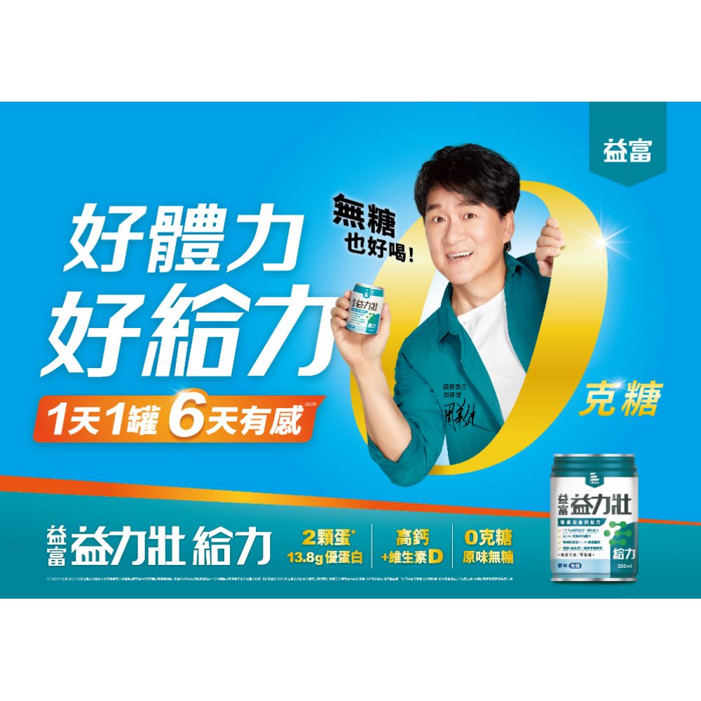 商品名稱:【益富】益力壯給力優蛋白高鈣配方-原味無糖 商品規格:250ml*24罐 商品重(容)量:7598公克 保存期限:15個月 原產地(國):台灣 食品業者登錄字號:A-109418034-00000-7 投保產品責任險字號:22A0043921